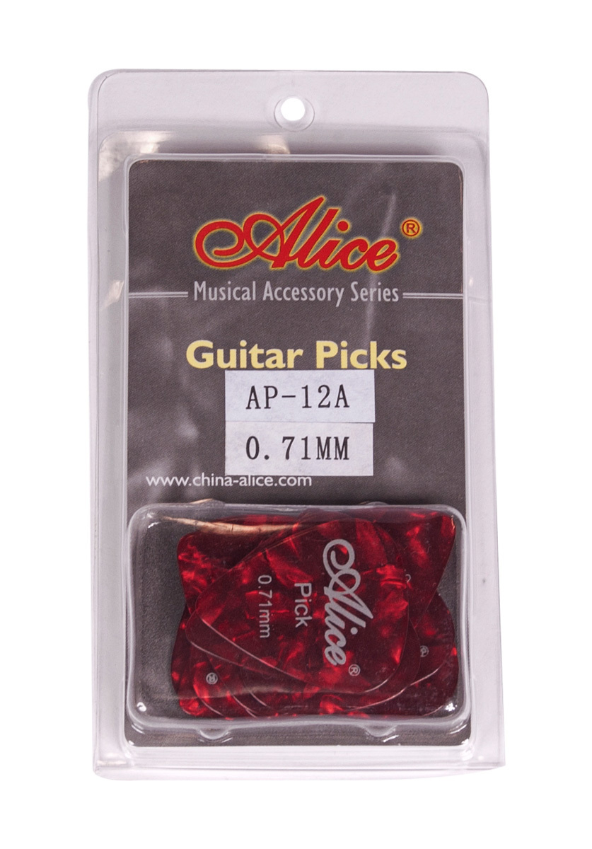 Alice guitar picks (plectrums) are made from a high quality celluloid material and have great flex and durability. Celluloid picks are also easy to grip even when you hands are sweating up!