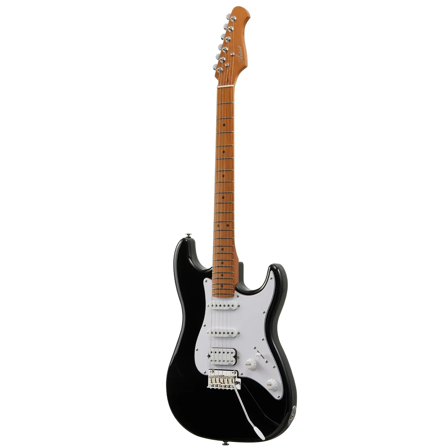 The Artist AS20 Black Electric Guitar delivers classic ST-style playability with versatile HSS pickups for bright cleans and powerful lead tones. It has a roasted poplar body, roasted maple neck, two-point tremolo and padded gig bag, ideal for beginners.