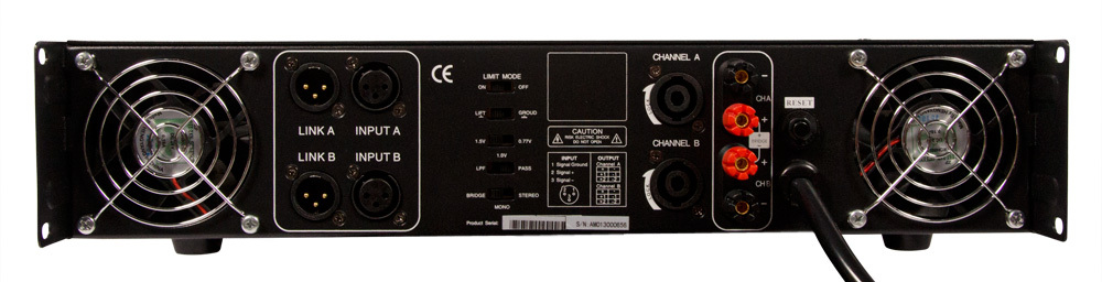 The PS-4.5 has 5 easily accessible switches on the rear that all have an important function. It is recommended to set the Limit Mode switch to ON, which will protect the amp from any accidental or potentially damaging spikes in signal. In addition, there is an LPF function in case of the need to eliminate the bottom end frequency range from the signal, a Ground Lift to assist in eliminating any ground hums, Input Voltage selector (to match to +4dB and -10dB line level signal types) and a Mode Selector that allows use in bridge, mono or the standard stereo channel mode.