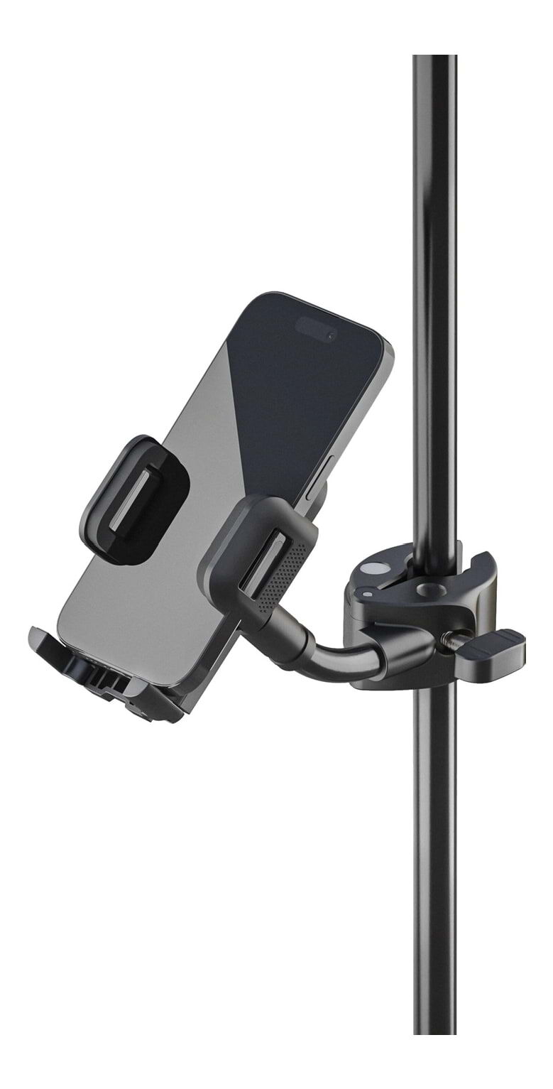 The K&M 19761 is a universal clamp-on smartphone holder with 360° rotation, ball joint, and flexible arm for optimal positioning. Fits devices 45–90mm wide and mounts to stands 10–30mm in diameter. Ideal for musicians, presenters, and content creation setups.