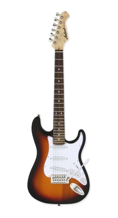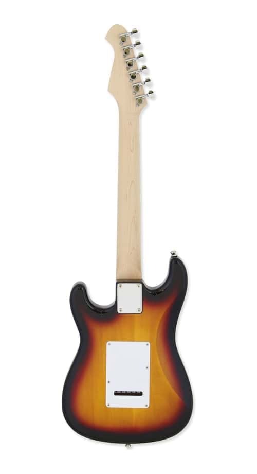 The Aria ARSTGMINI3TS Electric Guitar finished in classic 3 tone sunburst lacquer is ideal for getting your youngster off to a flying start. High build quality features a basswood body with a maple bolt on neck and stained walnut fretboard. 3 single coil pickups and a 5 way selector switch ensure a wide variety of tones, and a tremolo arm lets you add a little vibrato to your performance. The scale length is 580mm, making this a best buy guitar for children (age approx 7 to 13). Great as a travelling guitar for an adult as well.