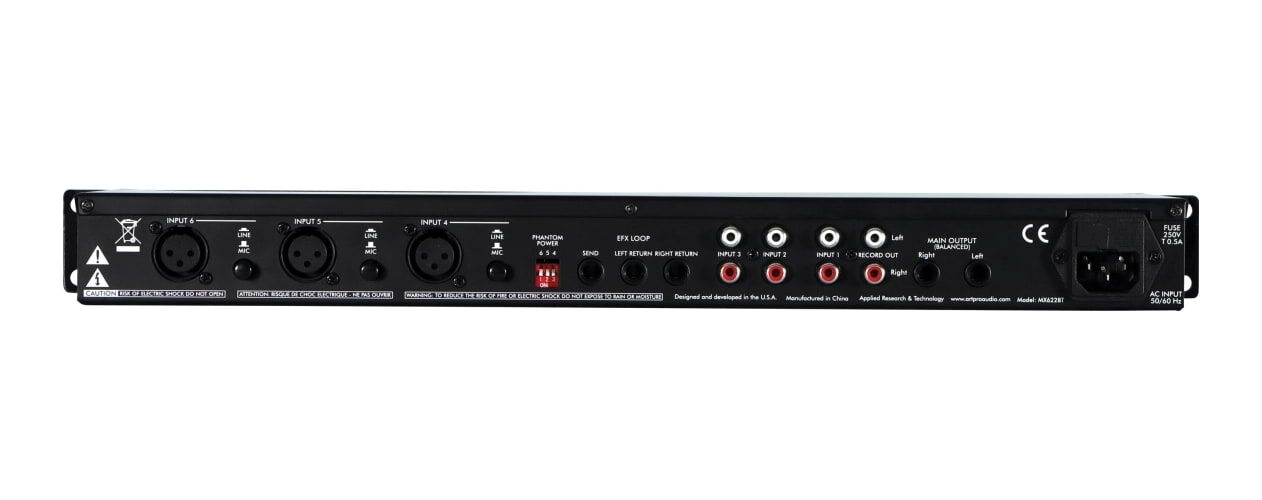 | Maximum Input Level | -10 dBu/+20 dBu Mic/Line XLR inputs, +20 dBu RCA line inputs, +20 dBu EFX inputs |