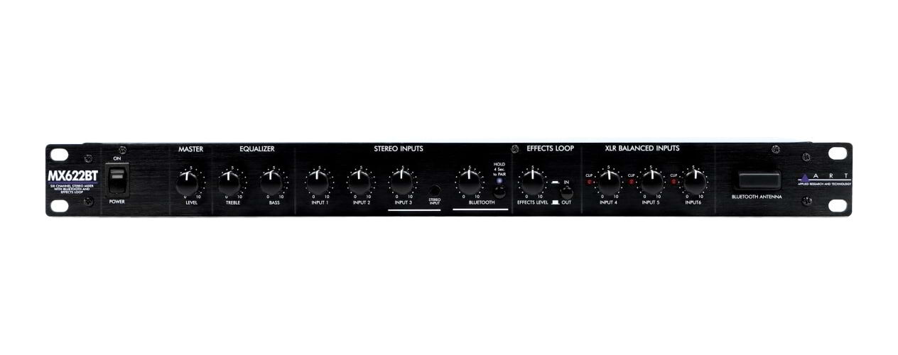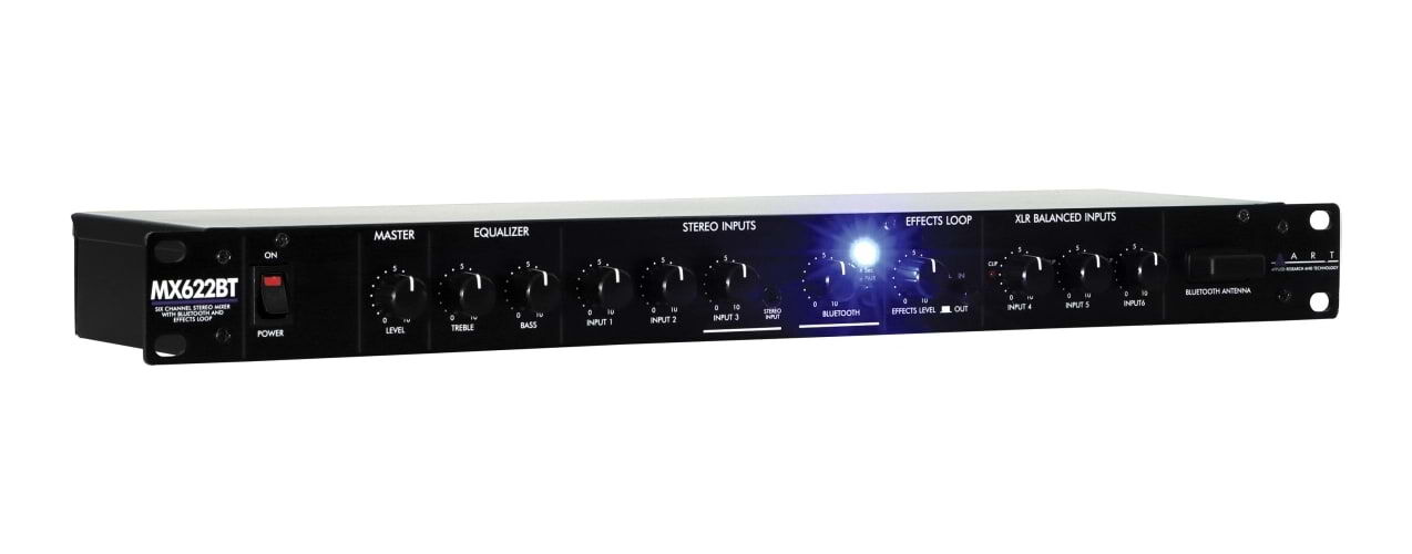 The ART MX622BT is a 1U rackmount 6-channel stereo mixer featuring 3 mic/line XLR inputs (with phantom power), 3 stereo line/RCA inputs, Bluetooth 5.0, effects loop, master EQ, and balanced outputs - ideal for versatile audio setups.