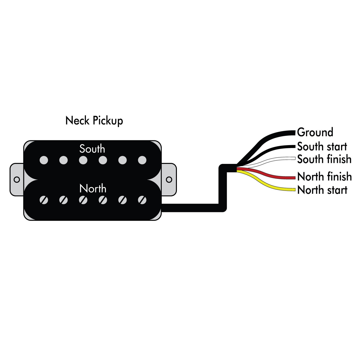 To use this as a standard humbucker in series configuration, the White & Red wires are soldered together and taped; both Black wires are grounded and Yellow is Hot Output. If you want to coil-split, then attach the Red and White wires to the coil switch. This means that when coil splitting, Black and White are not involved because they are both grounded, which deactivates the North coil. To split to the North coil, the process is much the same, but you'll switch the position of the thin black and yellow wires, making the thin black wire the Hot start, and the yellow wire will be grounded. This means when the switch is activated, both Red and Yellow are grounded, deactivating the South coil.