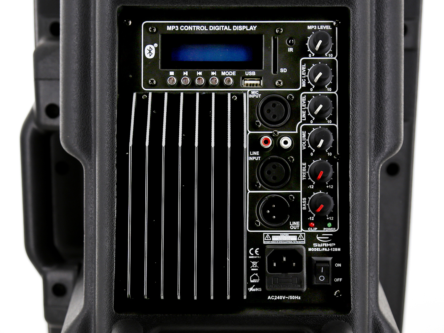 The PAJ-12BM is SWAMP's all-round workhorse PA speaker, with a bi-amped design that delivers a clear, rounded, full range sound. Featuring direct inputs for microphones and line level audio signals, 2 band EQ control, 180W of power in a monitor / foldback option speaker box.