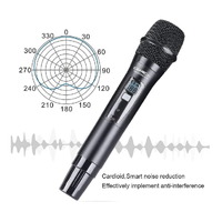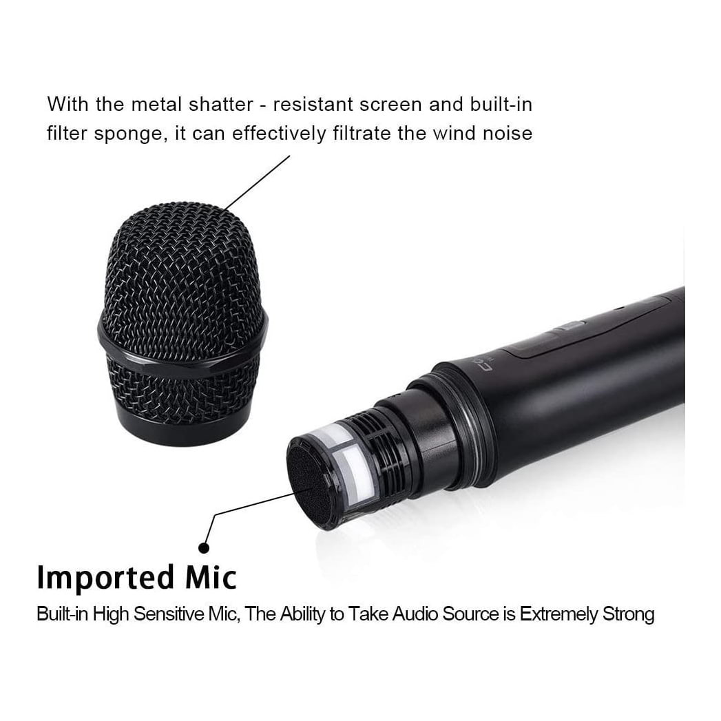 The handheld microphone is powered by 2 AA batteries. The working time is up to 3-5 hours.
