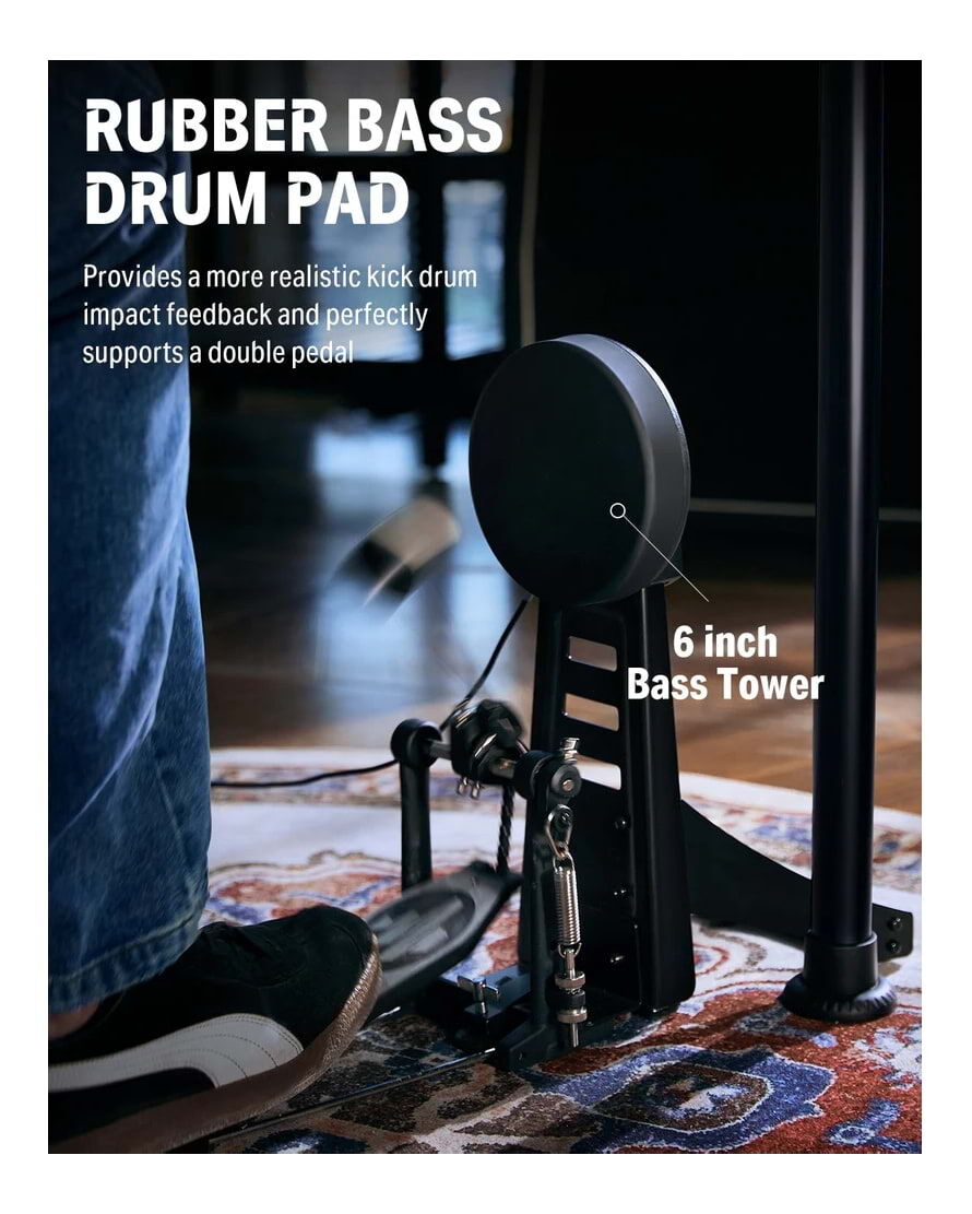 Everything you need is included: a foldable iron metal stand with a stable and secure 4-post aluminum rack, hi-hat control, bass drum pedal, headphones, drum throne, audio cable, and drumsticks.