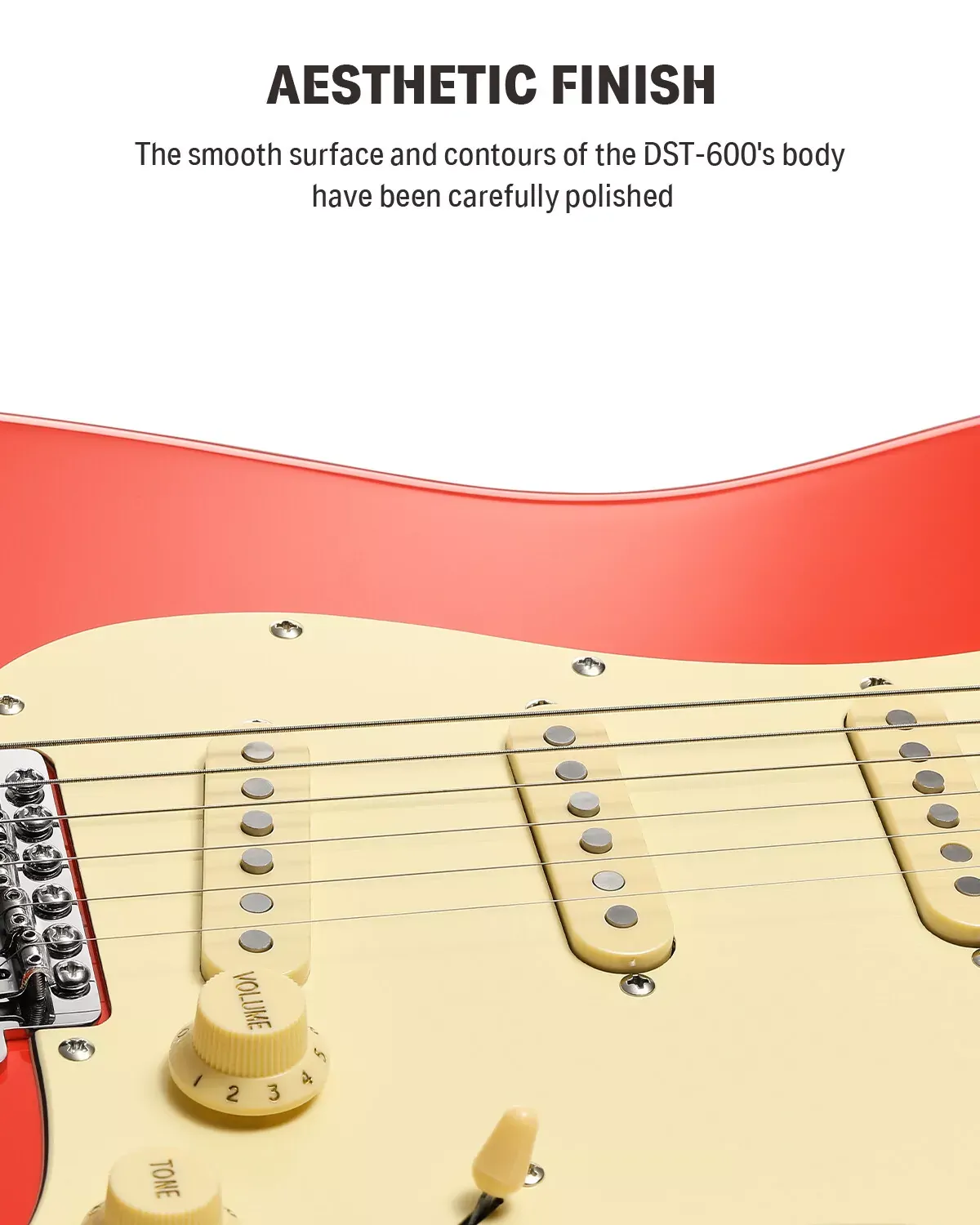 Alder is used for the guitar body to produce a strong and well-balanced tone. The DST-600 accurately delivers the classic and distinct tonal character to your fingertips and ears. The smooth surface and contours of the DST-600's body have been carefully polished. The durable six-point tremolo bridge is equipped with steel saddles. Its design enables a more convenient and extensive variety of height adjustment. As a result, the DST-600 can achieve perfect intonation. The DST-600 has the traditional four screw bolt-on construction and the electroplating procedure's closed knob. The modern “C” neck features smooth rolled edges for comfort and speed.