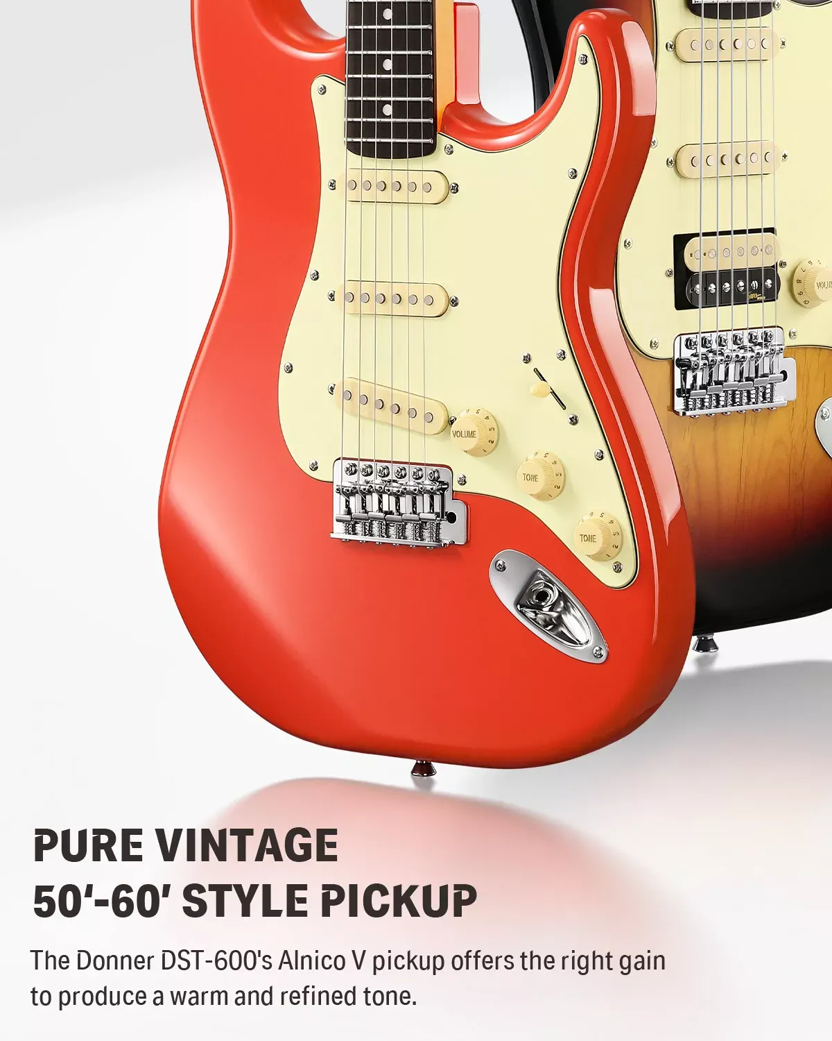 Sunburst SSS - The Donner DST-600 is a Strat-style electric guitar with an alder body, maple neck, 9.5″ radius, stainless steel frets, and bone nut. SSS with coil-split, it features Alnico V pickups, vintage tremolo and a classic finish.