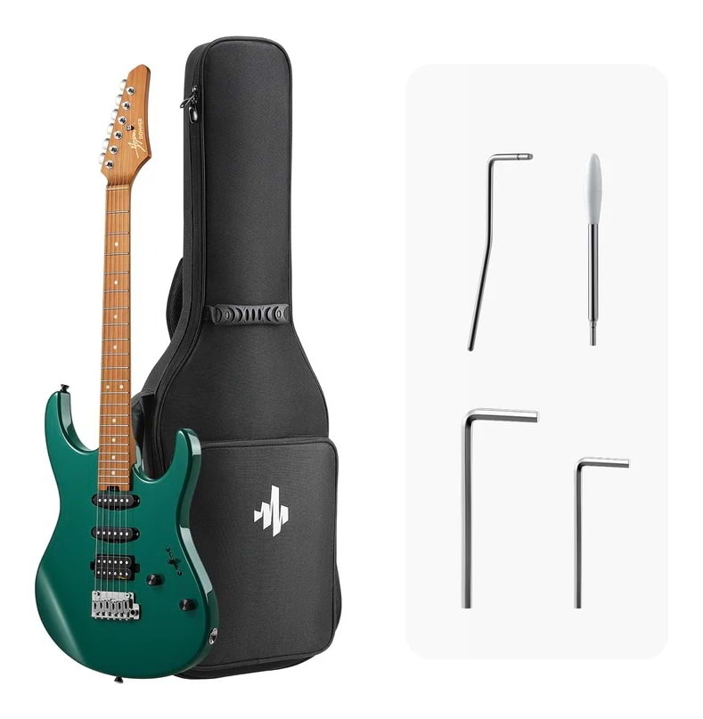 Built for modern guitarists who demand versatility, the Donner DST-700 Electric Guitar in Obsidian Black finish is designed to excel across various genres. Its ergonomic contour, paired with an Alnico V HH pickup configuration and locking tuners, delivers a smooth, high-performance experience. The roasted maple neck and basswood body offer durability, while the satin finish enhances playability.