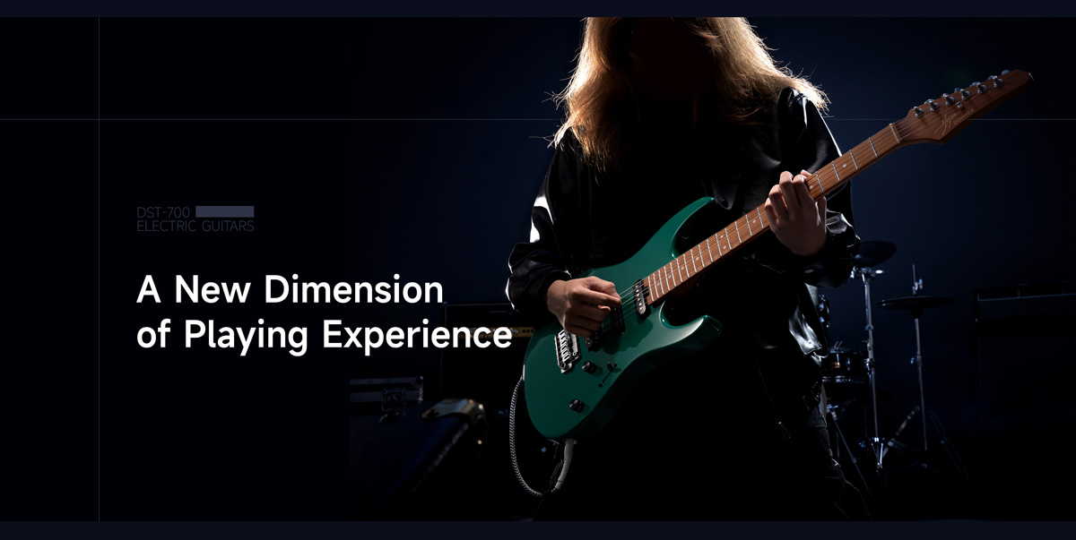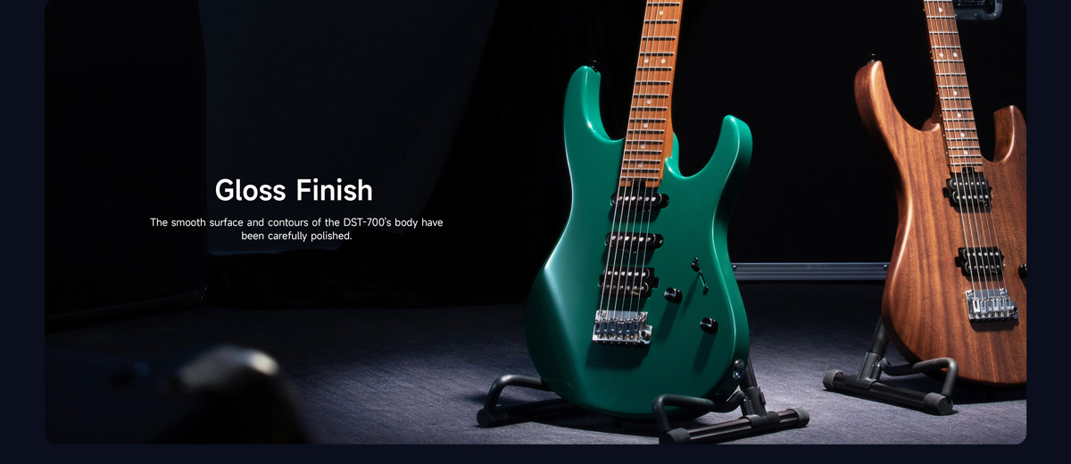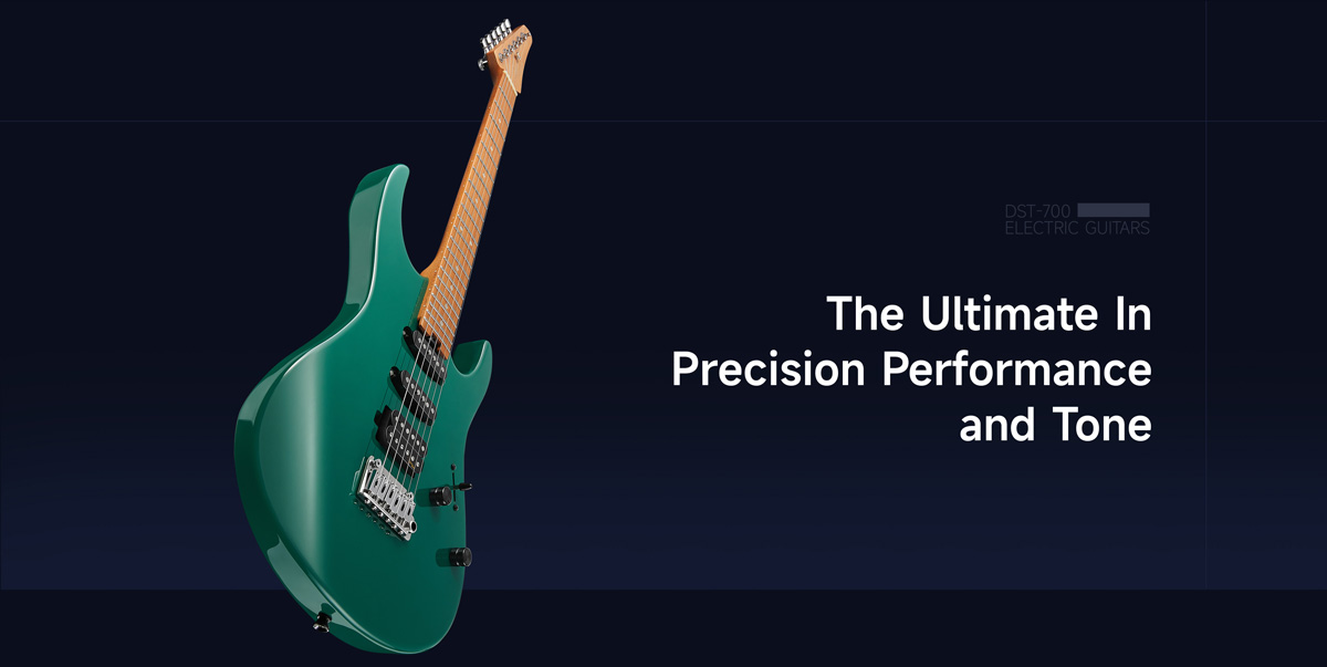 The DST-700 reimagines a classic model with a bold, ergonomic design and advanced features. This guitar showcases a 5-piece roasted maple neck bolted to a basswood body, optimized for stability and fast, intricate playing. Crafted for high-performance, the DST-700 is built for players who push boundaries.