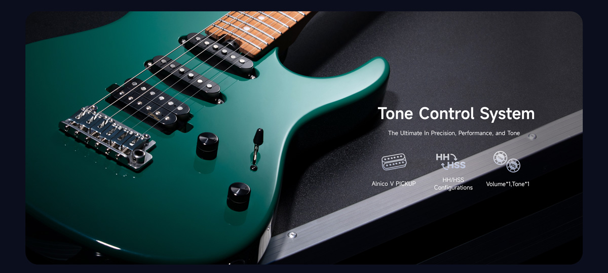 The HH pickup configuration features high-quality Donner Lab-designed pickups with Alnico V magnets known for their rich tonal range and durability. This model is equipped with the Donner JAZZ Humbucker NK in the neck position and the Donner Versa Humbucker BRG in the bridge position, which supports coil-splitting via the push/pull tone control for versatile sound options. With a 3-way switching system, players can easily switch between humbucking and single-coil modes, making the DST-700 adaptable to various styles and musical genres.