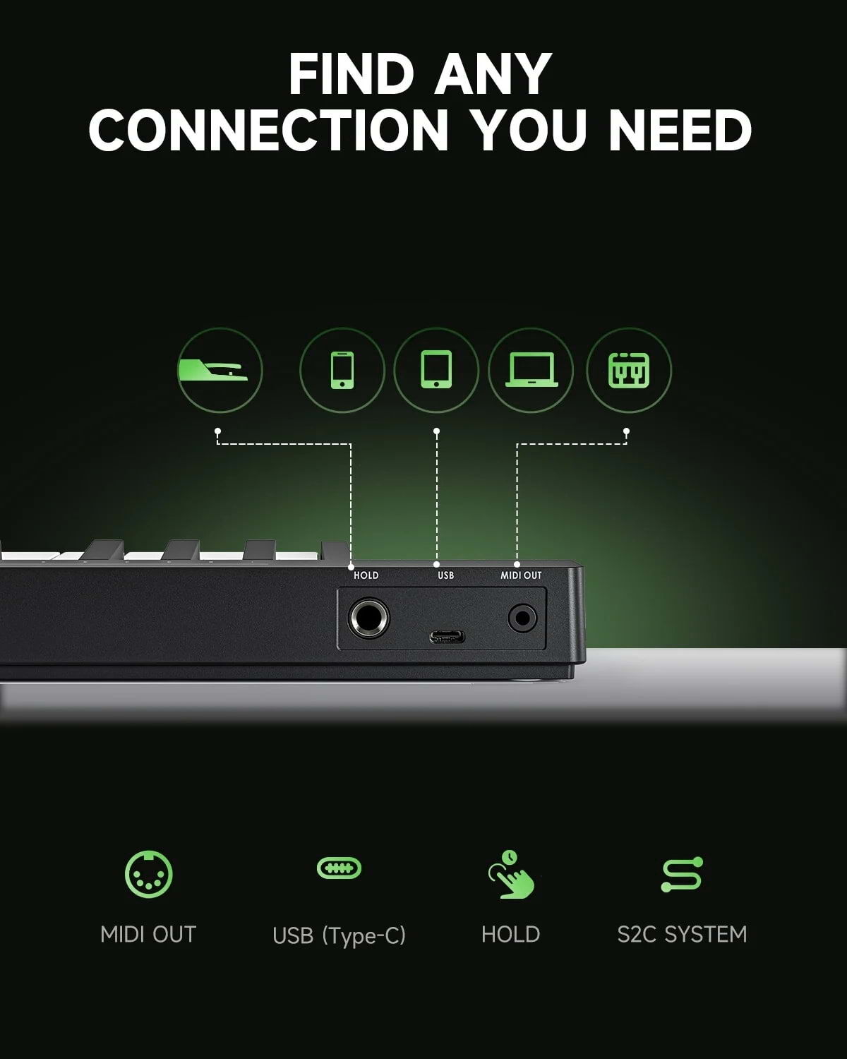 - Snap2Connect (S2C) magnetic dock for cable-free power and MIDI between keyboard and synth