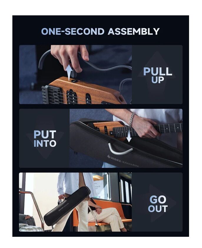 The HUSH-X electric guitar weighs only 4.4 pounds and features a headless portable design, making it half the volume of a traditional electric guitar. Its compact size allows the gig bag to fit in an airplane overhead bin, ensuring you can take your music anywhere you go. With upgraded quick assemble brackets, the HUSH-X electric guitar eliminates tedious disassembly processes. You can now assemble and disassemble the guitar in just one second, providing convenient plug-and-play functionality for musicians on the move.