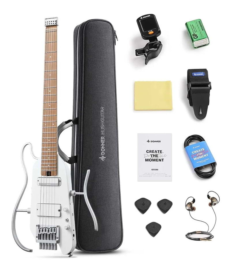 The HUSH X PRO electric guitar kit comes complete with a gig bag, headphones, charging cable, 1/4’ cable, guitar strap, and more—everything you need to kickstart your musical journey