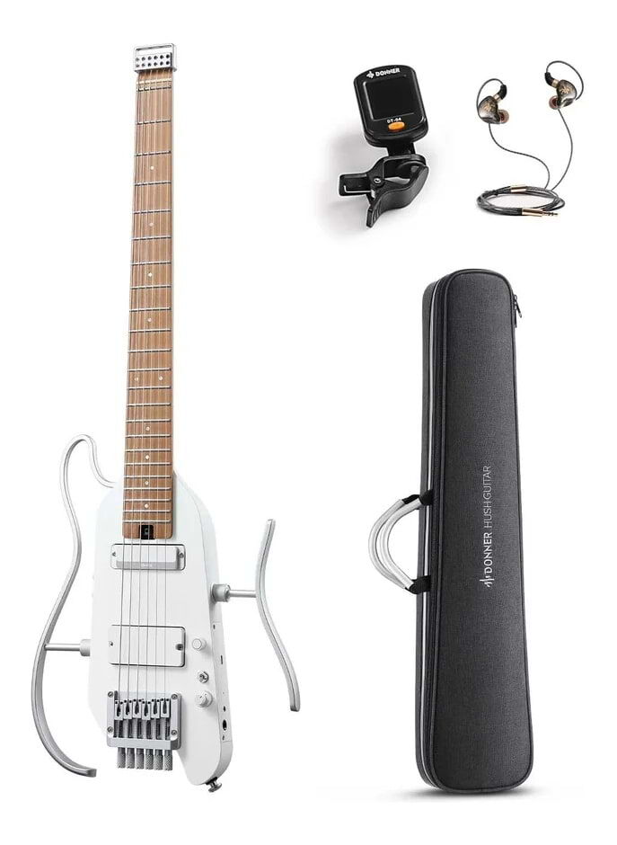 White - The Donner HUSH X PRO is a lightweight, headless smart travel guitar with a detachable frame, dual humbuckers, coil-split, Bluetooth input, and silent practice functions - perfect for portable play, practice, and performance on the go.