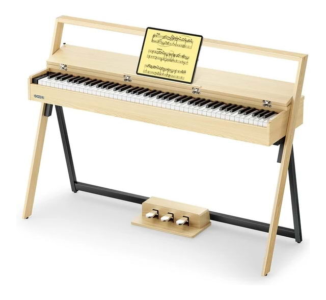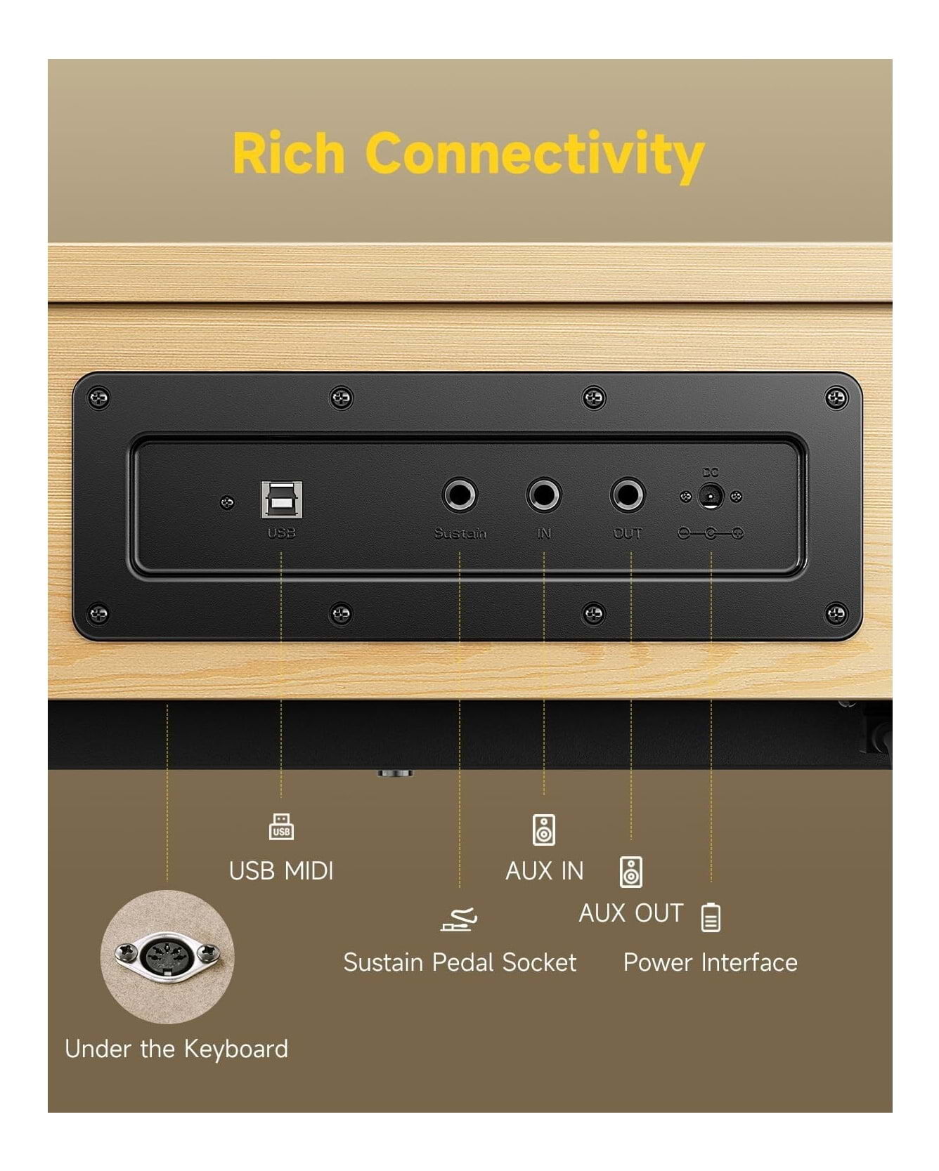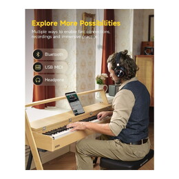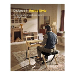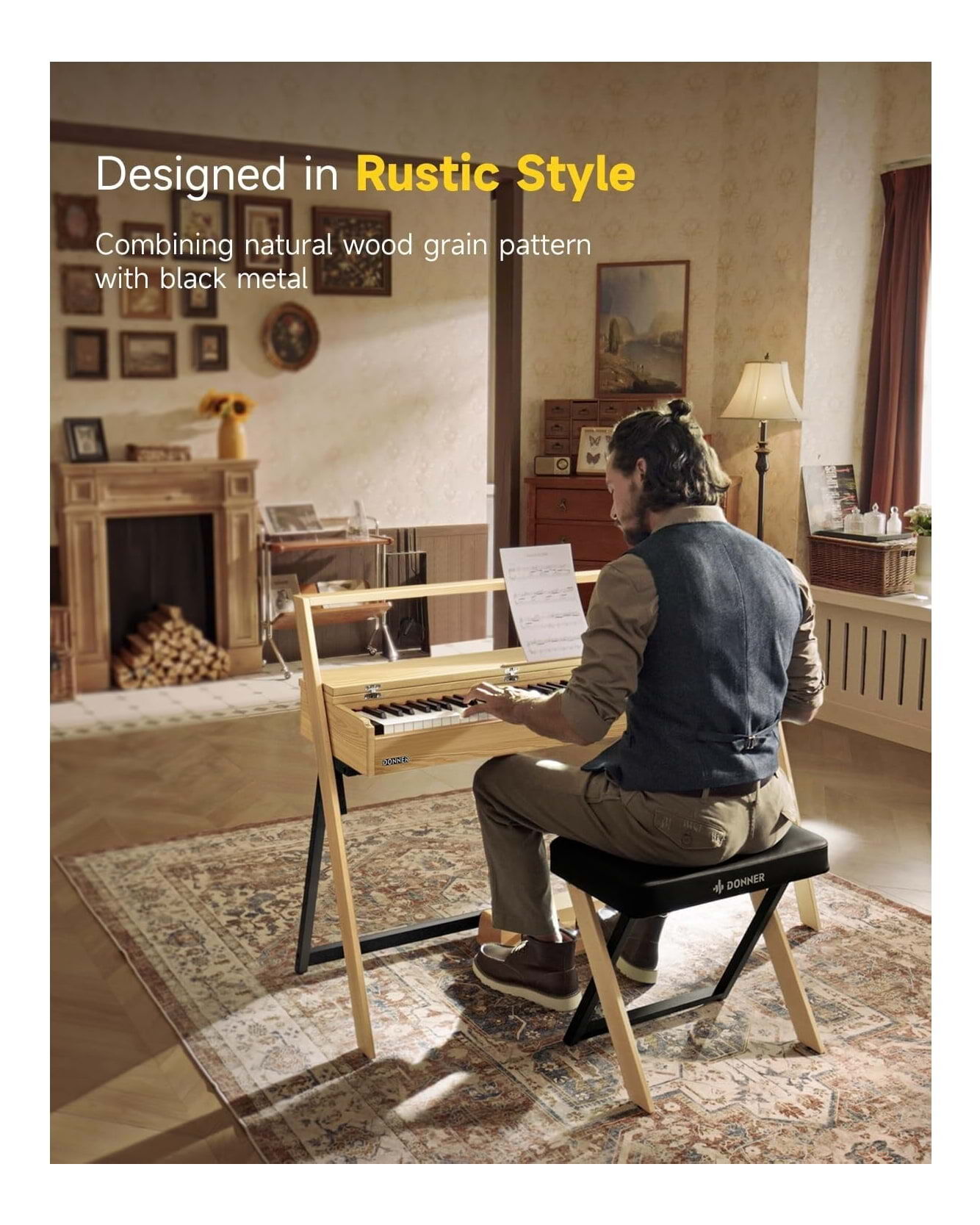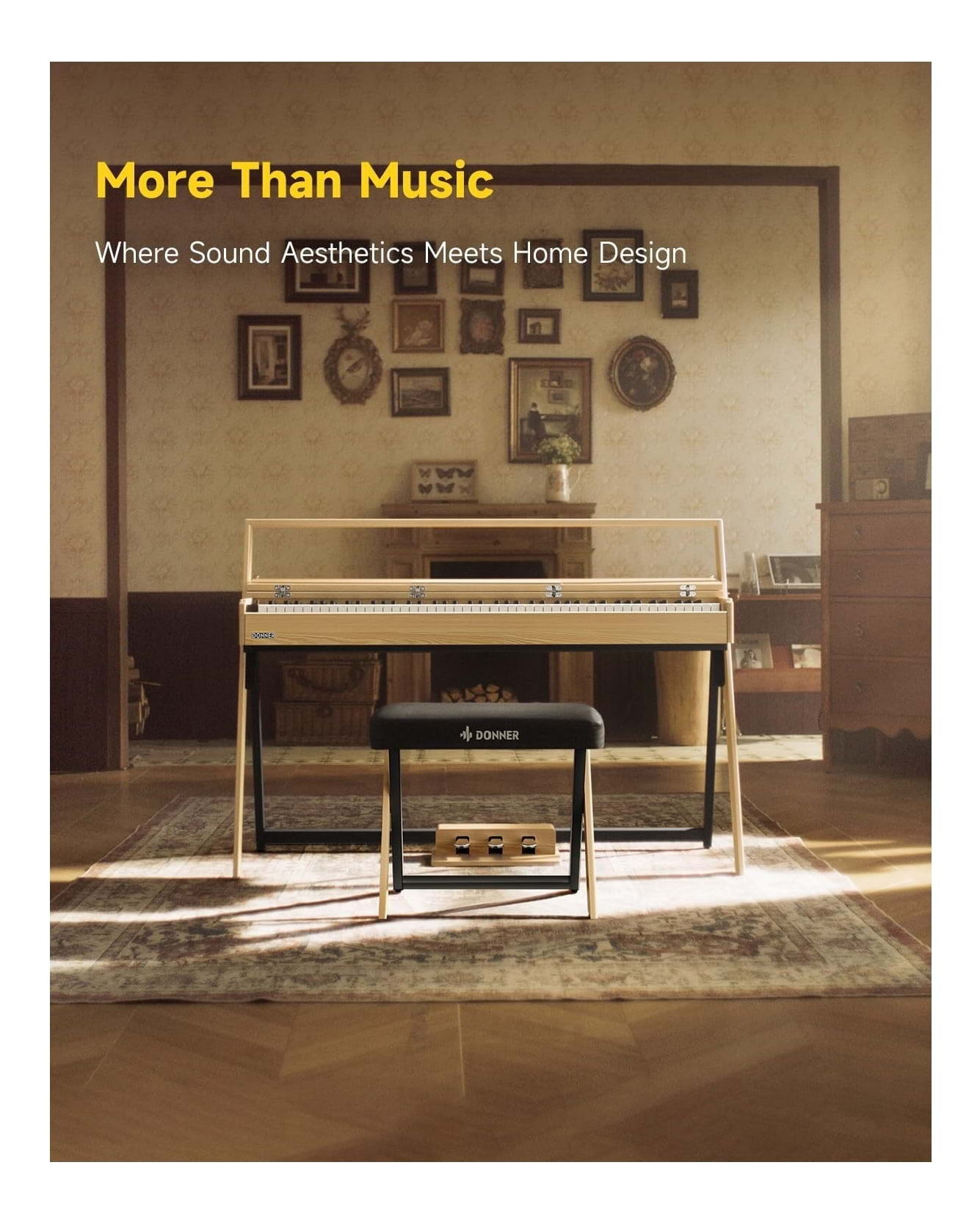 The R300 blends a natural wood grain finish with sleek black metal, creating a cozy yet modern aesthetic ambiance for your room. Donner OURA R300 home digital piano creates a harmonious blend of music and aesthetics, turning every practice session into a delightful experience. Designed in American Rustic Country Style combining natural wood grain with industrial black metal for a striking design contrast. It's not just a digital piano, but also a piece of home art.