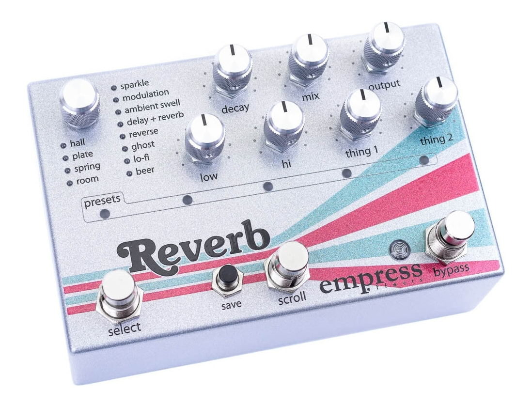 For the most lush and versatile reverb collection, the Empress Effects Reverb excels. The pedal has 12 algorithm types, some include multiple variations, eg vintage and studio plate, dark and bright springs. Stereo ins and outs, control port and MIDI.
