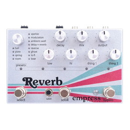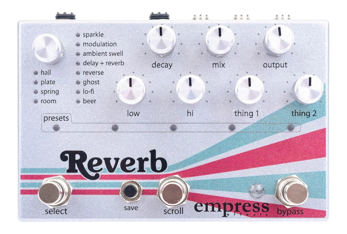 Realistic simulations of spaces, as well as never-before-heard surreal ambiances are represented with stunning sound quality. Sporting stereo ins and outs, a small footprint and all the controls at your finger-tips, it strikes the perfect balance of control and ease of use, avoiding laborious menus. Presets, the versatile control port, and MIDI open up a world of possibilities for live performances. Whether you're looking for a classic spring, realistic room or new sonic flavors to expand your creativity, this pedal delivers. And....it's got a beer mode!