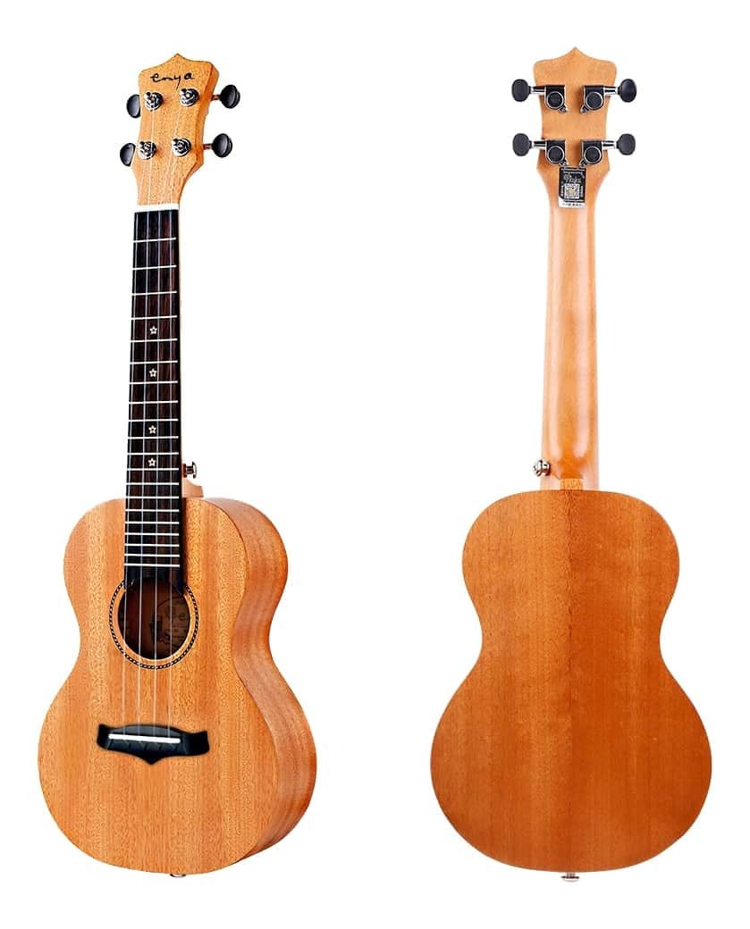 Natural - The Enya 25D solid mahogany concert ukulele is a fantastic instrument for beginners and beyond! Great sustain and intonation. Solid mahogany top, laminated mahogany back and sides, richlite fingerboard, strap buttons, and available in two colour