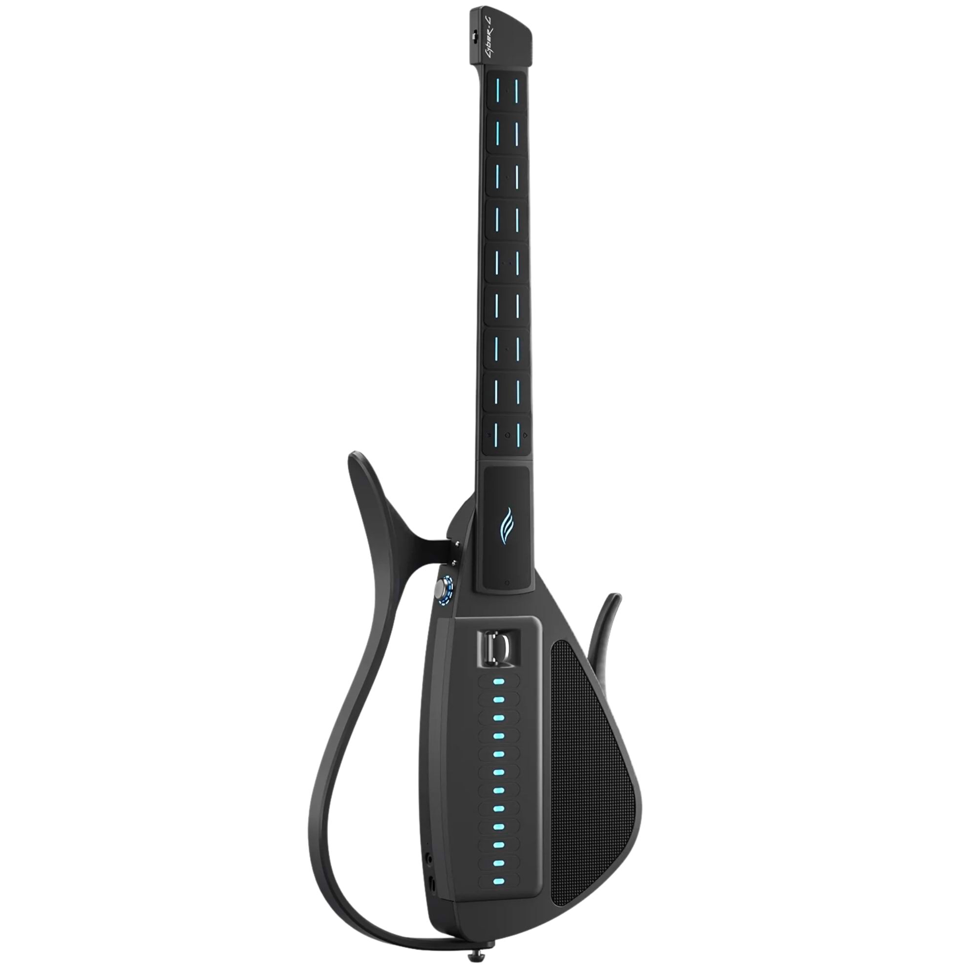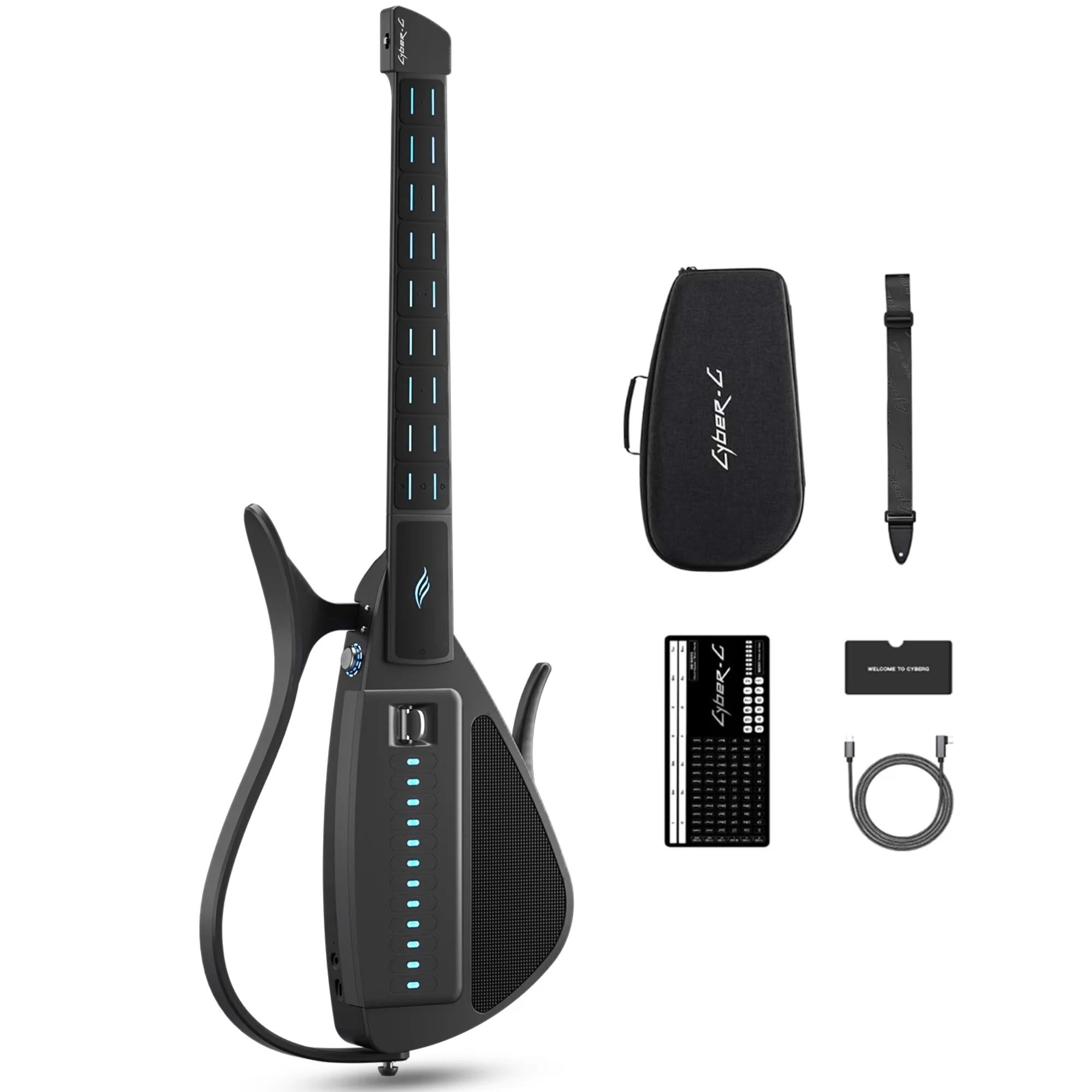 Black - Cyber-G stringless smart guitar hybrid with Pick Module for rhythm performance. 30W speaker system, Smart Chord backing, app/DAW integration, Bluetooth, MIDI, and rechargeable battery.