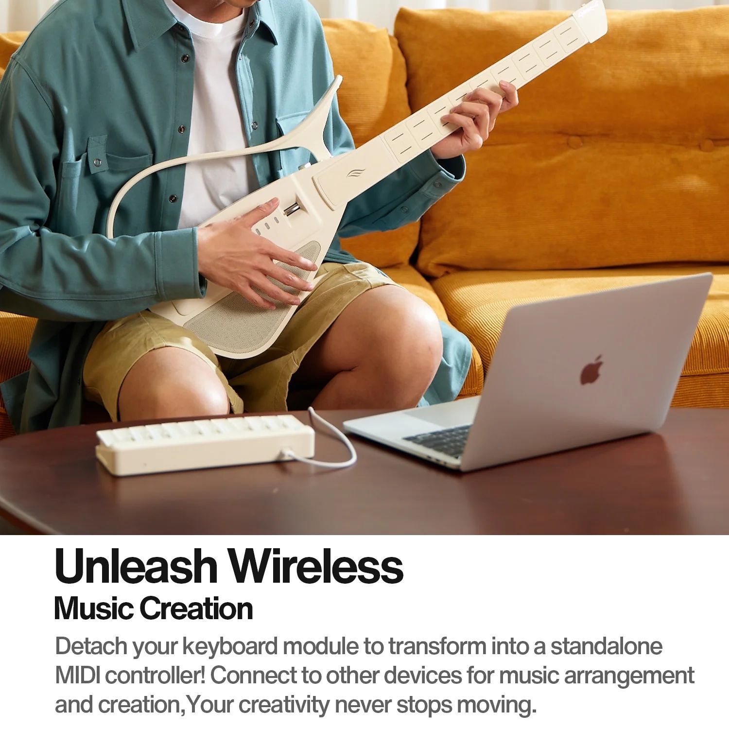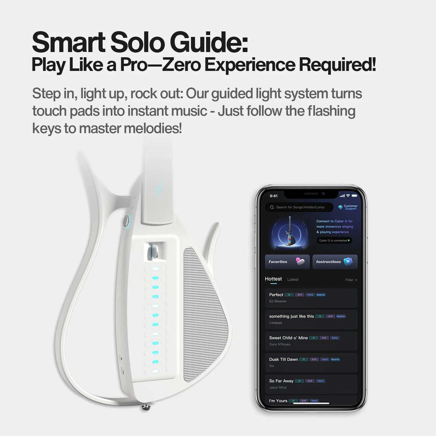 A futuristic, modular performance instrument with built-in speaker and smart app control. The Enya Cyber-G redefines what a performance instrument can be. Combining a stringless guitar form with digital music tech, it includes illuminated chord pads, the Pick Module for rhythm performance, a built-in 30W speaker system, and Enya's companion app. With real-time chord backing and guided Smart Tabs, it's ideal for vocalists, beginners, and mobile performers seeking a compact, all-in-one setup. The Keyboard Module is available separately as an optional add-on.