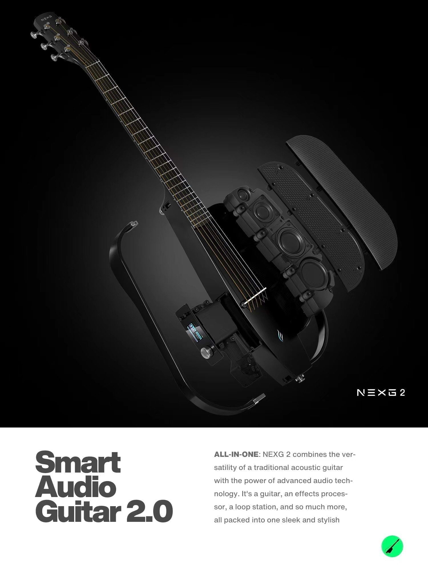 The NEXG 2 combines the versatility of a traditional acoustic guitar with advanced audio technology, packing multiple features into one sleek instrument. Ignite your creativity with its integrated effects, drum beat, tuner, and vocal remover features, enhancing your playing experience. Shape your sound, add rhythm, stay in tune, and play along effortlessly. Seamlessly connect the NEXG 2 to your smart devices and use it as a wireless speaker, allowing you to stream music, play along with backing tracks, or enjoy high-quality audio wherever you go. Control your effects, loops, and settings with ease through the NEXG 2's intuitive touch-screen interface. Enhance your experience further by integrating with the companion app, unlocking additional features and customisation options.