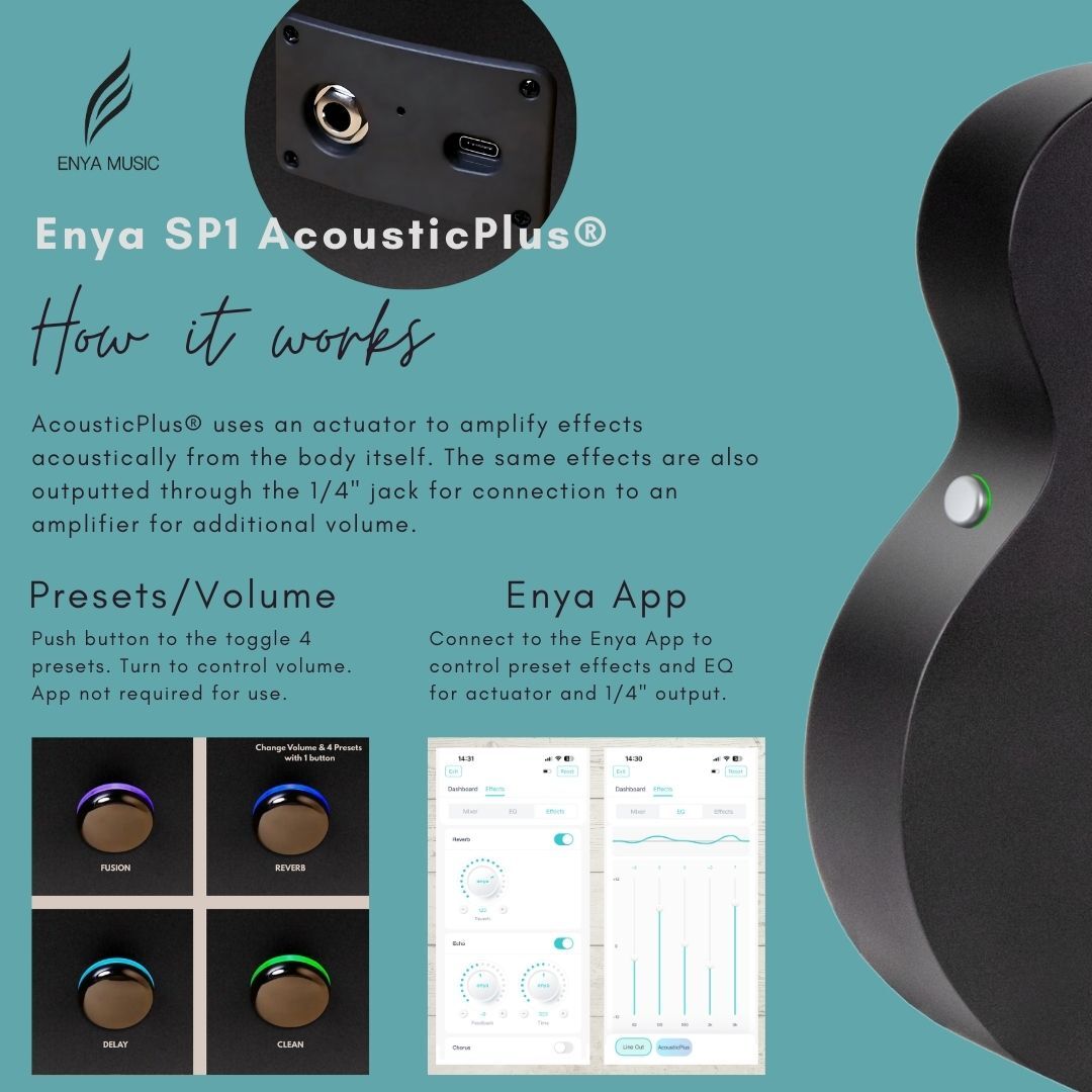 When connected to an amp or PA, it functions as a full-featured acoustic-electric system, complete with a 5-band EQ for shaping your sound. The SP1 system also connects to the Enya App, where you can fine-tune effect parameters, adjust EQ settings for both the actuator and line output, and fully customise your tone.
