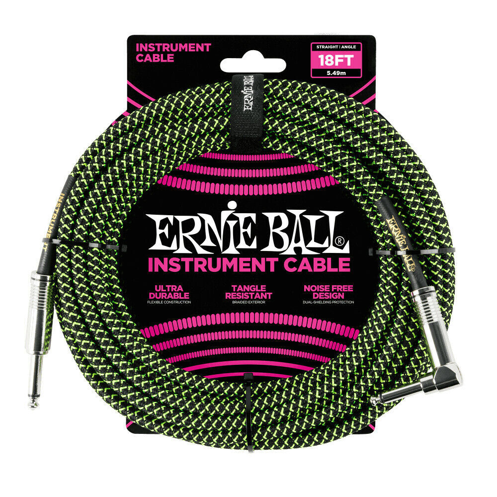 Black/Green - 18ft / 5.49m Braided Jacket EB-60 Series Ernie Ball Instrument Cables. With multiple shielding, and dual-conductors, you'll experience clearer tone, less noise, and superior durability. Clean signal that's both quiet and accurate full range