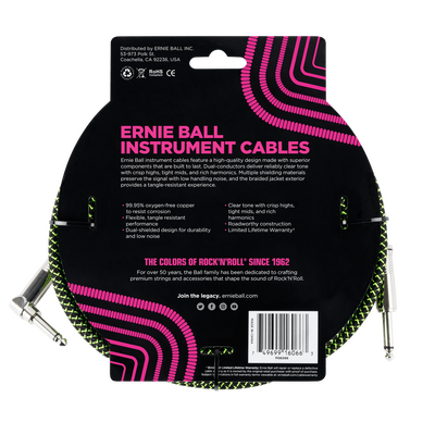 Black/Green - 25ft / 7.62m Braided Jacket EB-60 Series Ernie Ball Instrument Cables. With multiple shielding, and dual-conductors, you'll experience clearer tone, less noise, and superior durability. Clean signal that's both quiet and accurate full range
