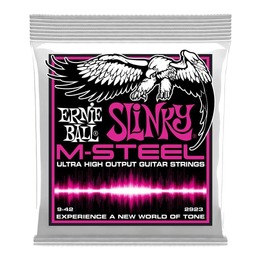 Ernie Ball's M-Steel Super Slinky electric guitar strings are extra loud and expressive. M-Steel (Maraging Steel) is a superalloy used in high-stress situations, like aerospace and the defense industries.