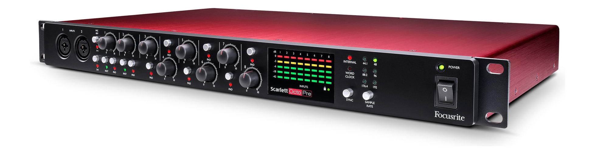 The Focusrite Scarlett OctoPre is a rackmount 8-channel mic preamp and AD converter, offering eight clean and transparent Scarlett mic preamps with combo XLR/TRS inputs, two of which are easily accessible on the front for instruments. 24-bit/192kHz A/D.