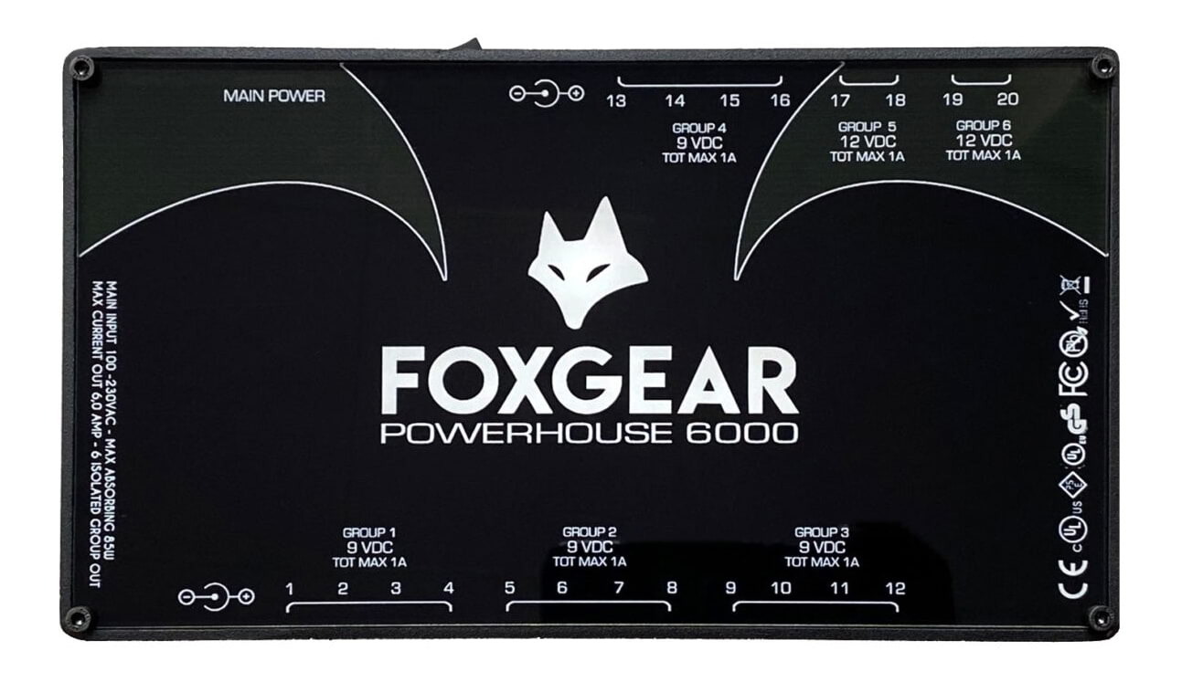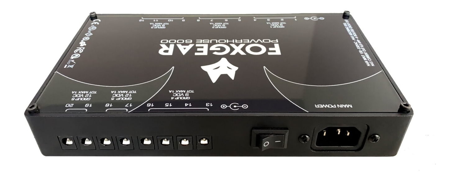 Foxgear's Powerhouse 6000 features up to 20 OUTS and a total of 6000mA available, that makes it the most powerful Power Supply in the market in a relative compact size. With 6 Isolated grounds, it is the best companion to touring pro and big pedalboards.