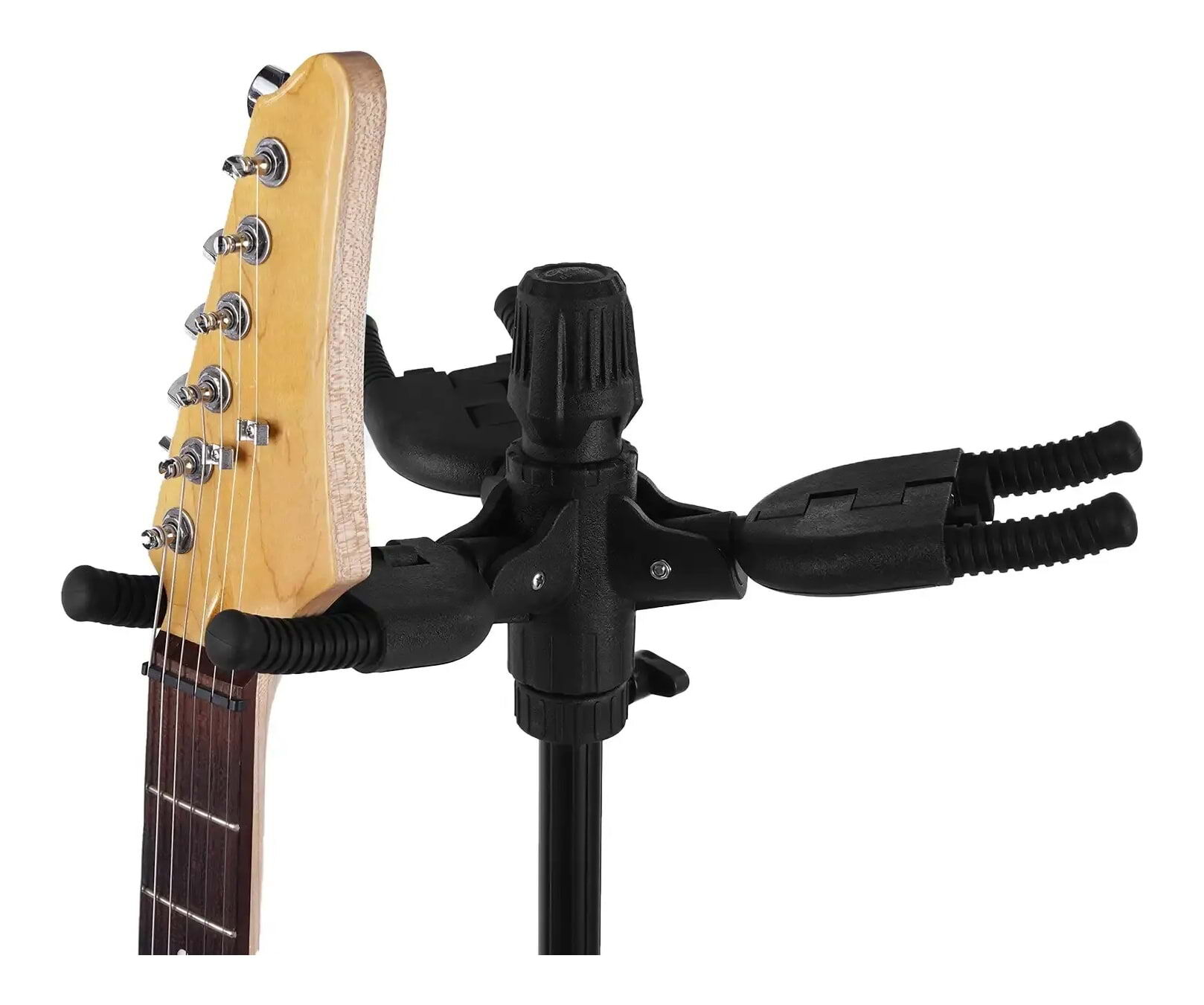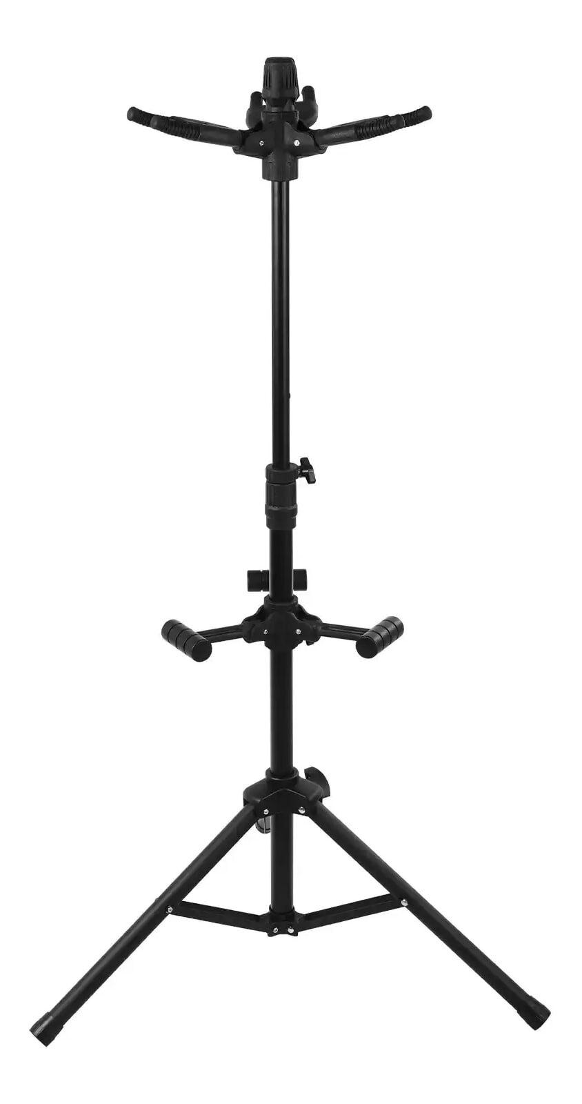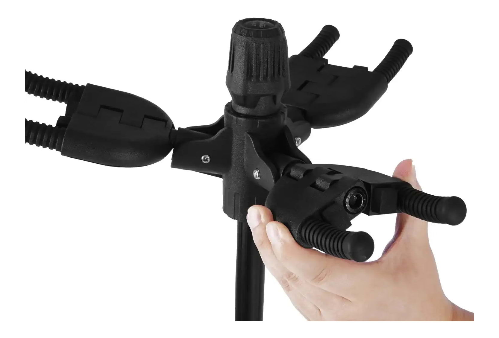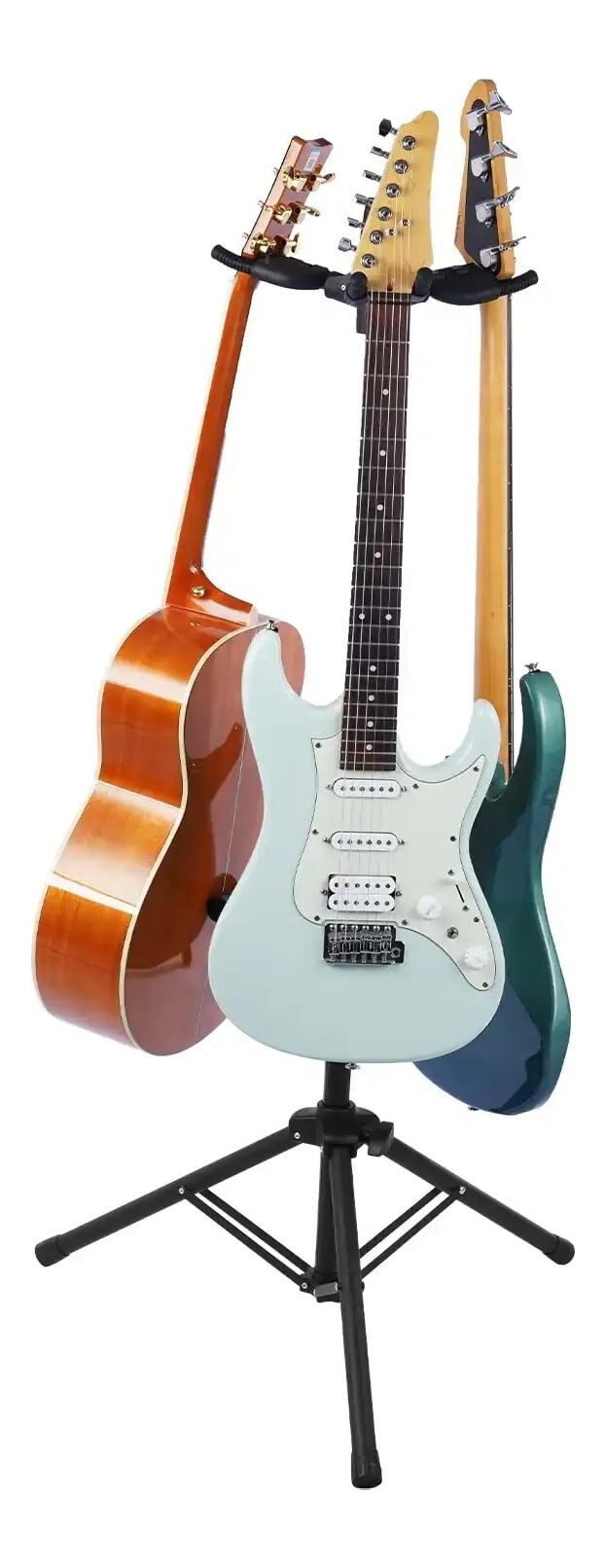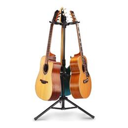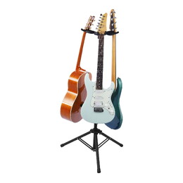 Ideal for securely holding up to three instruments at the same time, the Guitto GGS-06T Triple Guitar Floor Stand features hanger mechanisms that self-lock by gravity, great for different shapes of headstocks. Reinforced aluminium tube, sturdy tripod base