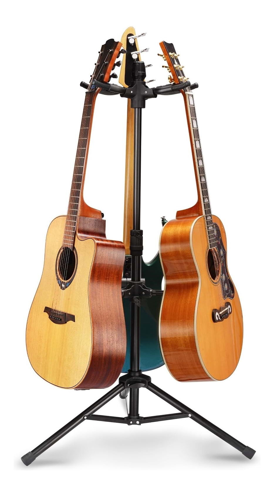 - Exceptional functionality as a versatile multiple guitar stand that securely holds three instruments