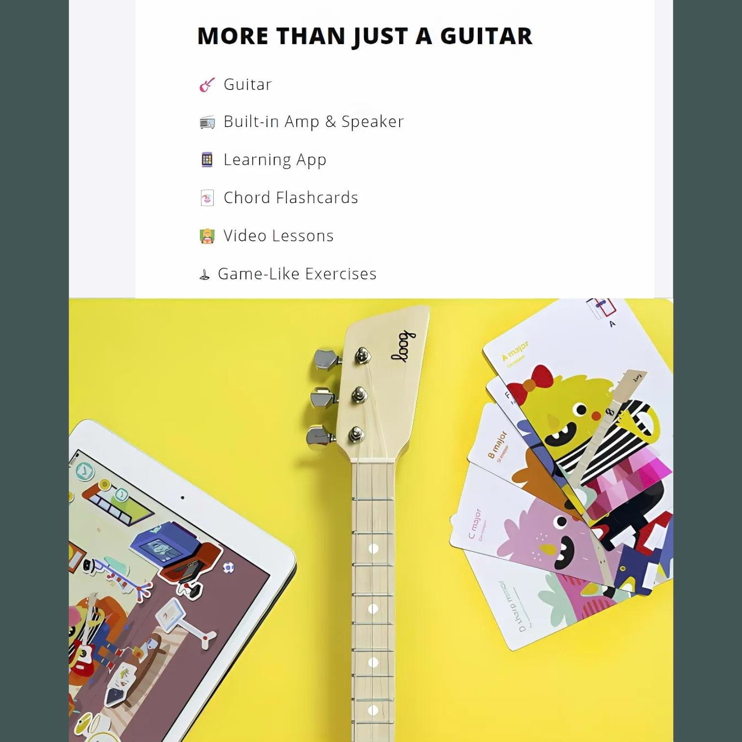 - Includes chord flashcards, free video lessons, and full access to the Loog Guitar app