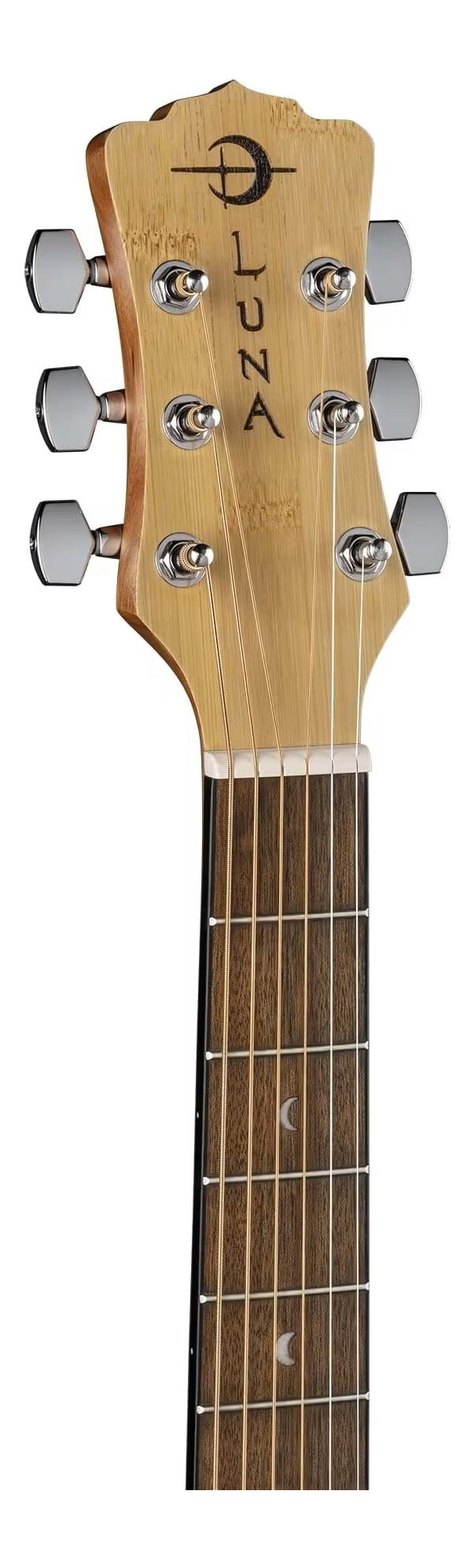 The Luna compact parlor-style acoustic-electric with bamboo top, back & sides, a mahogany neck and pau ferro fretboard with pearloid moon phase inlays, plus a Luna SL3 preamp with built-in tuner for stage-ready electronics. Eye catching design.