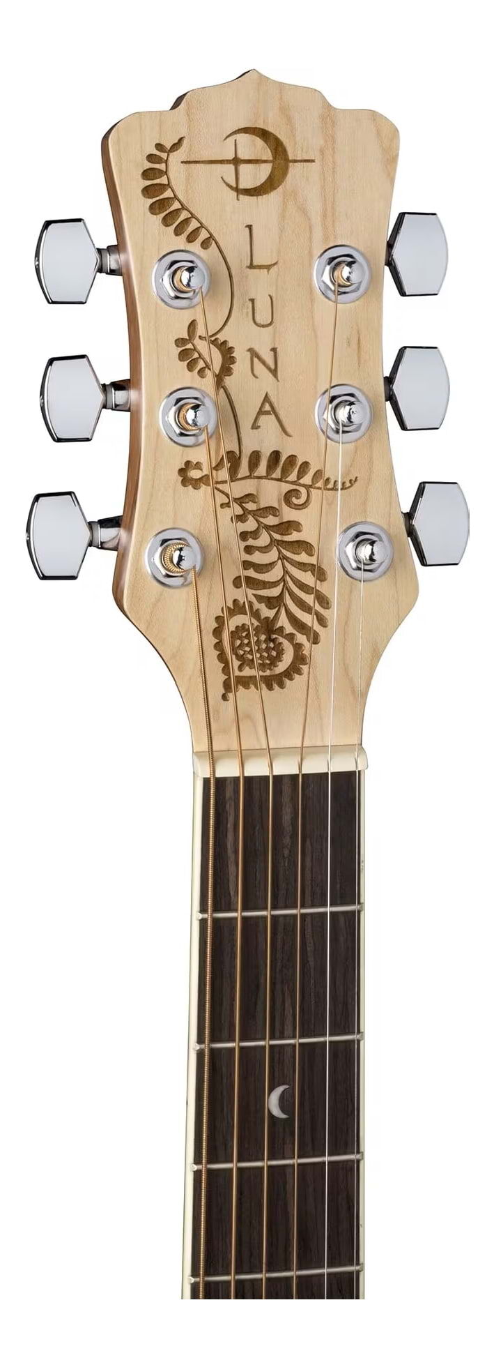 The Luna Henna Paradise is a beautifully detailed acoustic-electric guitar featuring a laser-etched design by UK artist Alex Morgan, select spruce top, mahogany back & sides, and a built-in Luna SL-3 preamp with tuner for stage and studio versatility.