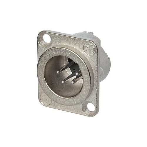 Neutrik NC4MD-LX 4-Pin XLR Male Panel Mount Connector, with solder cups, nickel housing, silver contacts. The DLX series features a compact all metal housing with an ingenious duplex ground contact, which offers excellent RF protection and shielding.