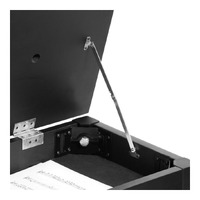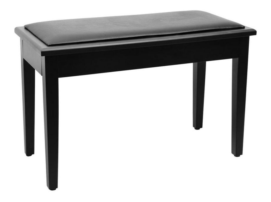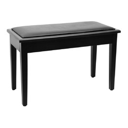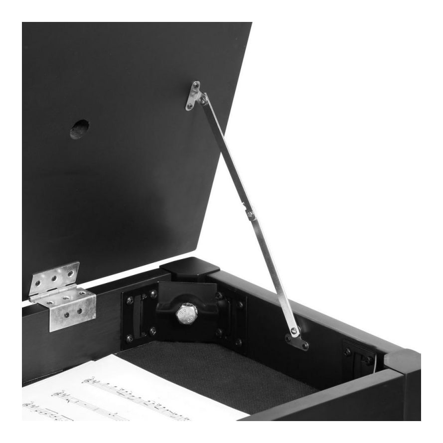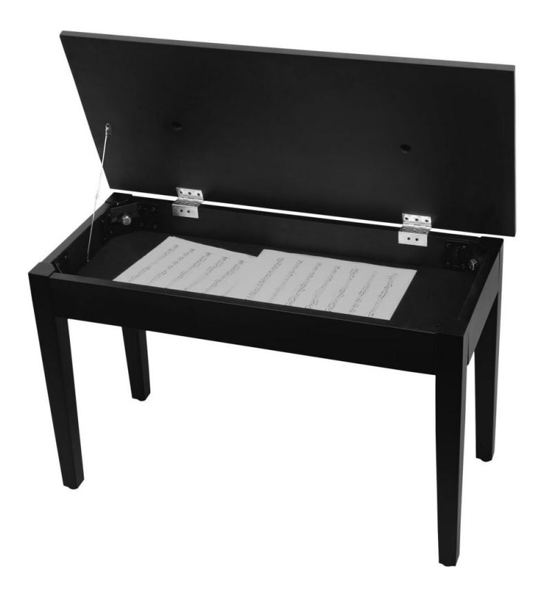 A beautiful black satin finish and smooth soft vinyl give this affordable bench a classic look. The hinged cushioned seat lifts to reveal a large compartment for sheet music, metronomes, and accessories. The Interior lining protects contents and prevents them from shifting. A locking arm holds the bench open to make storing or removing items easy. Solid wood legs and 1" padding provide a strong, comfortable, and steady base.