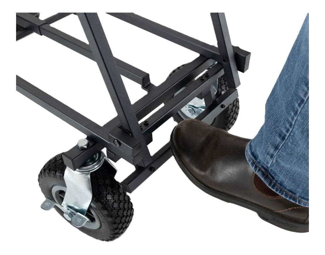 Capitalising on large treaded wheels and a heavy-duty frame, the UTC5500 All-Terrain Utility Cart lives up to its name. This burly cart hauls 250kg of gear in a single trip over rough or uneven surfaces including grass, gravel, dirt, and debris. The versatile bed expands to make room for large loads and it contracts to negotiate tight spaces. Ergonomically positioned handles at each end facilitate comfortable pushing, pulling, and steering by one person or by multiple people. The handles also fold flat against the bed to clear the way for oversized gear. While this capable cart is rugged and agile, it is also geared toward safety. Locking casters keep the cart from rolling during loading and unloading. Plus, eyelets on the frame provide anchor points for straps to secure equipment. And, despite its brawn, the cart folds into a compact configuration to make efficient use of storage space.