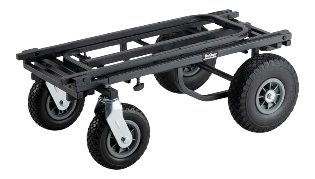 The On-Stage UTC5500 All-Terrain Utility Cart is a rugged, foldable cart with an expandable platform (76cm to 132cm) and a 250kg capacity. With 8″ swivel front wheels, 10″ rear wheels, lockable handles, and tie-down eyelets, great for rough terrain.