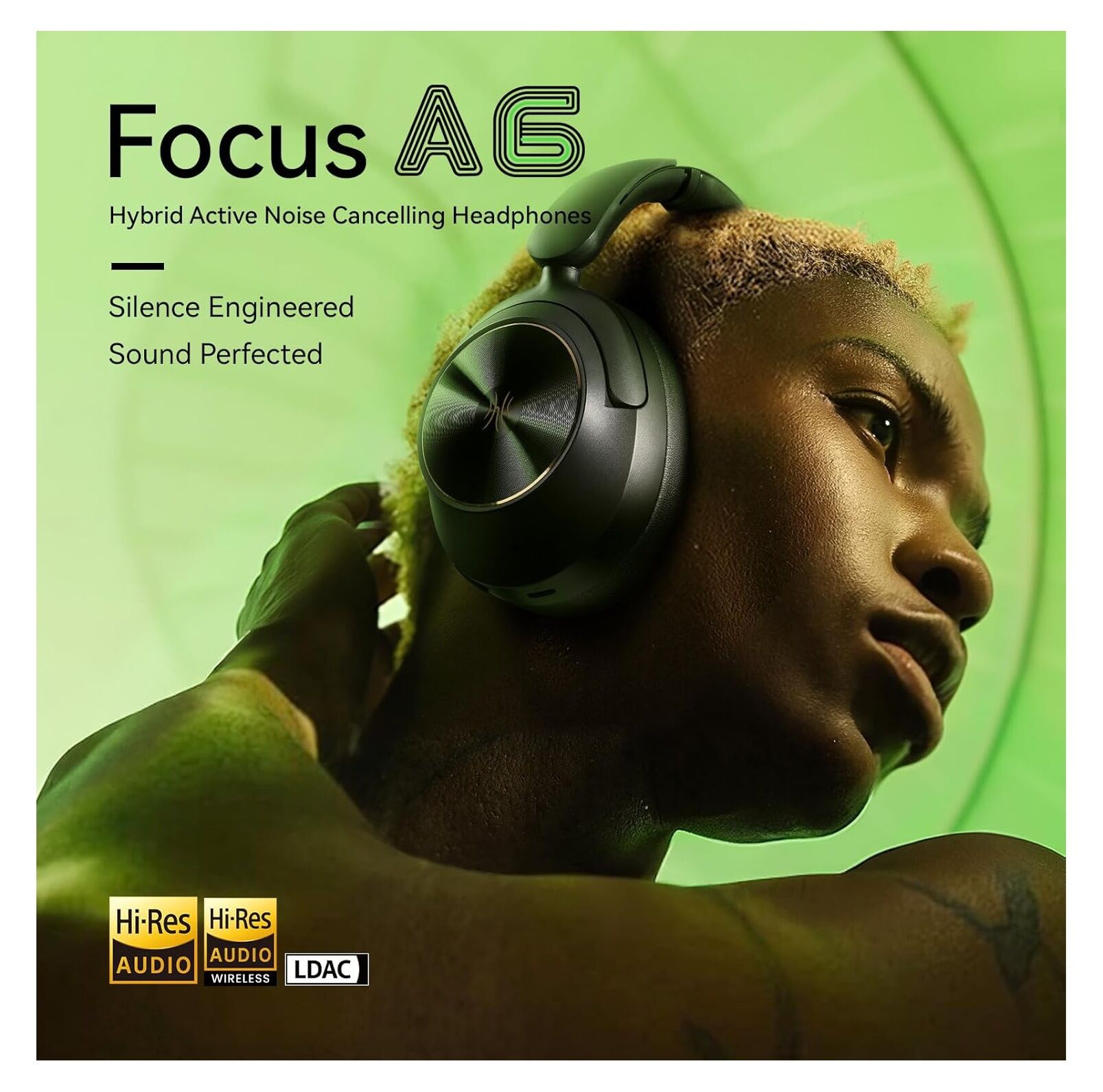 The Focus A6 features Hybrid Active Noise Cancellation technology with up to -48dB noise reduction depth. Put on the headphones, and the outside noise instantly fades away - like hitting the mute button on the world. It combines feedforward (FF) and feedback (FB) channels in a Hybrid Active Noise Cancellation system, supported by five high-sensitivity microphones that form a precise noise detection and feedback network.