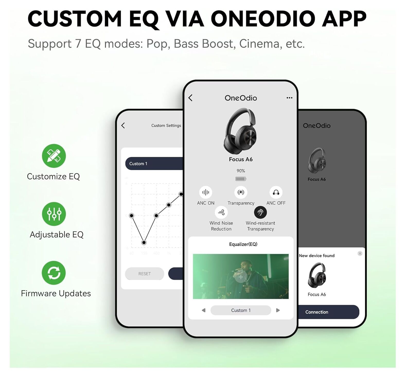 From bustling streets to quiet offices, switch between 5 smart noise control modes. The OneOdio app offers EQ presets, custom EQ slots, firmware updates, spatial sound toggle, and headphone location feature.