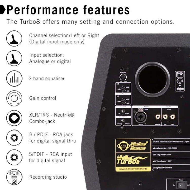 An incredible pair of active 8" nearfield studio monitor for the price! The Turbo series are widely popular in Europe, and ideal for recording, mixing and mastering home and pro studios. Great for DJ's, EDM production and large studios rooms. 110W RMS.