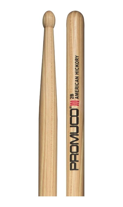 A pair of Promuco 18012B American Hickory 2B Wood Tip drumsticks. As a dense wood, Hickory has very little flex, providing for a powerful and pronounced sound. A great all round, balanced drumstick capable of withstanding plenty of shock.
