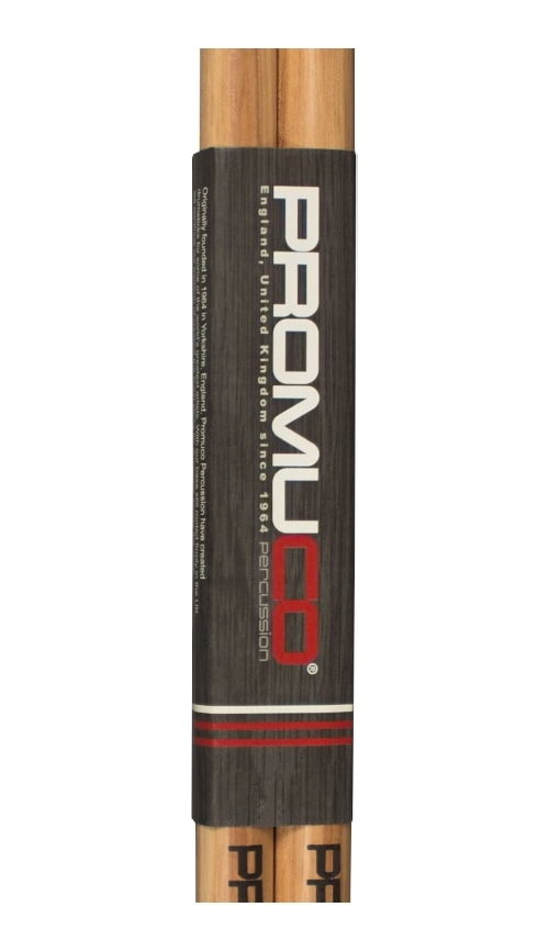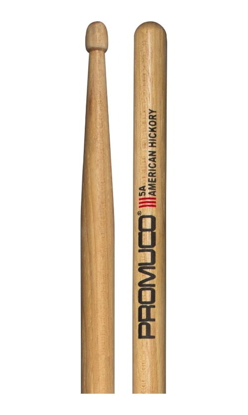 A pair of Promuco 18015A American Hickory 5A Wood Tip Drumsticks. As a dense wood, Hickory has very little flex, providing for a powerful and pronounced sound. A great all round, balanced drumstick capable of withstanding plenty of shock.