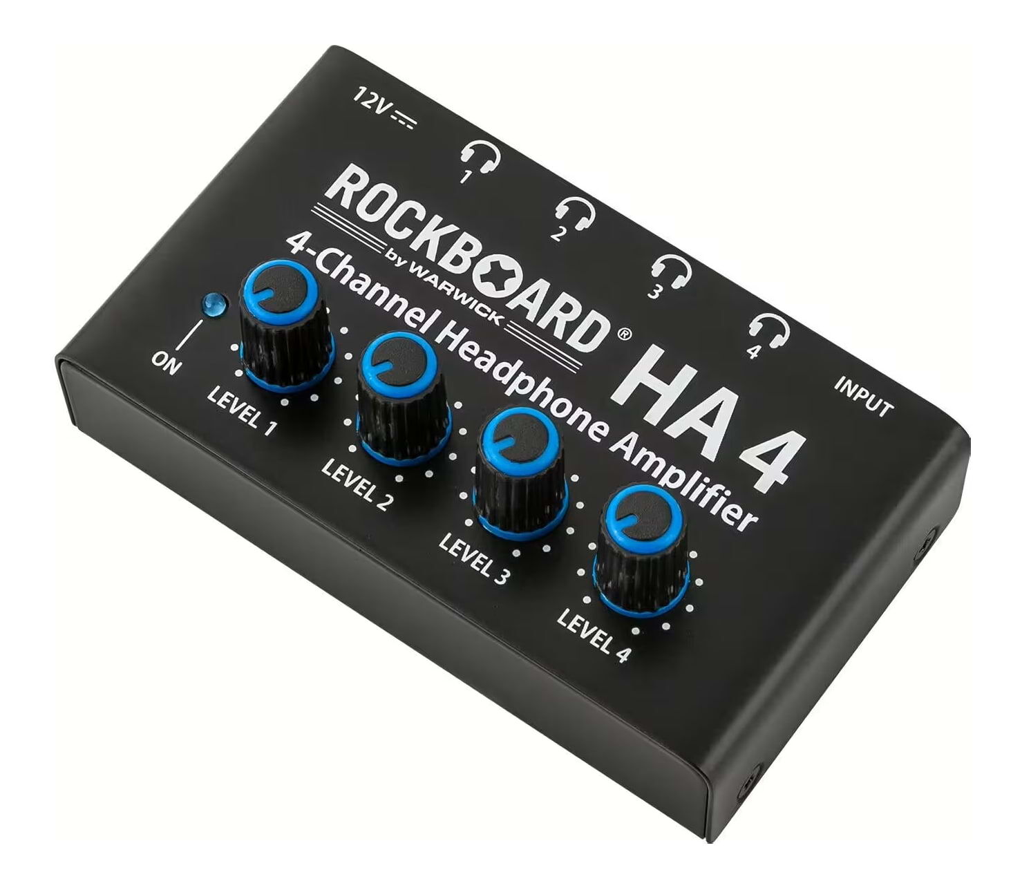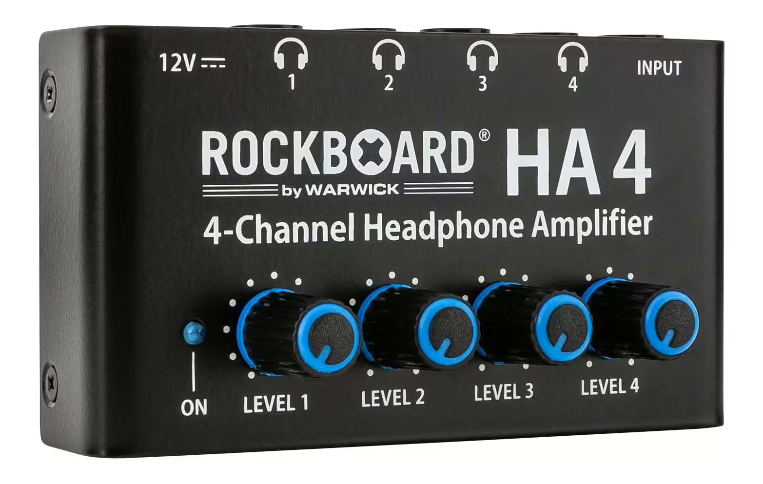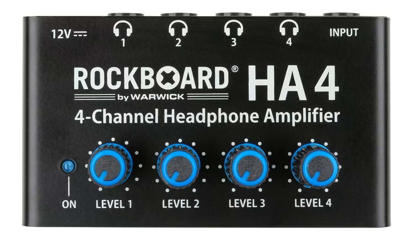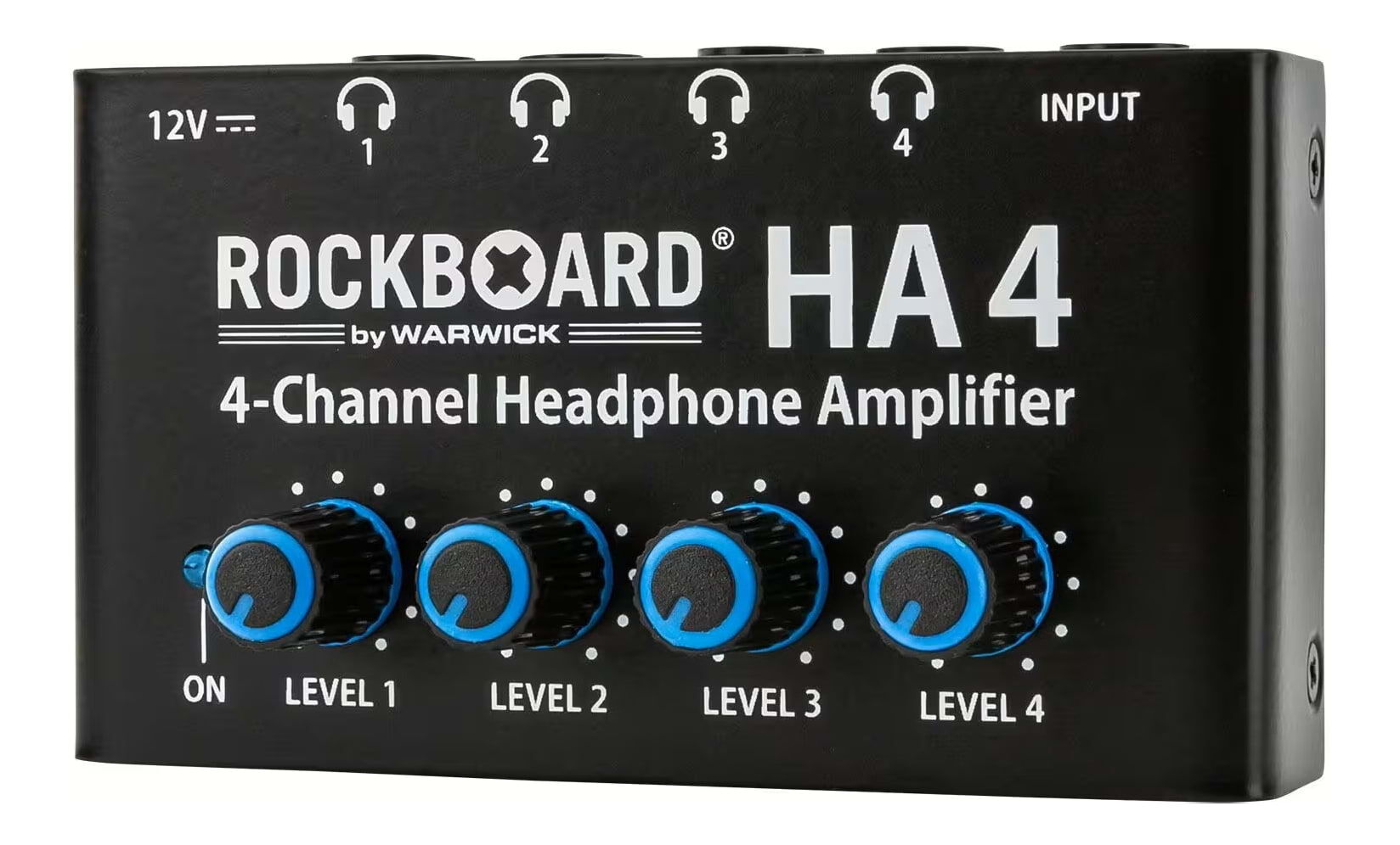 The RockBoard HA 4 Four-channel Headphone Amplifier is a rugged distribution amp that takes a single stereo input and provides four independent outputs, each with its own amplifier and volume knob, perfect for group listening, rehearsals, or recording.