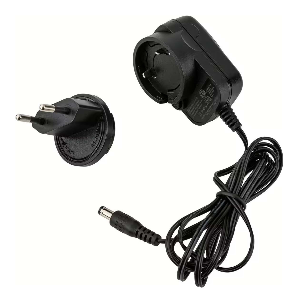 - 12V DC / 40 mA, 2.1 x 5.5 mm barrel plug, center negative, power supply included