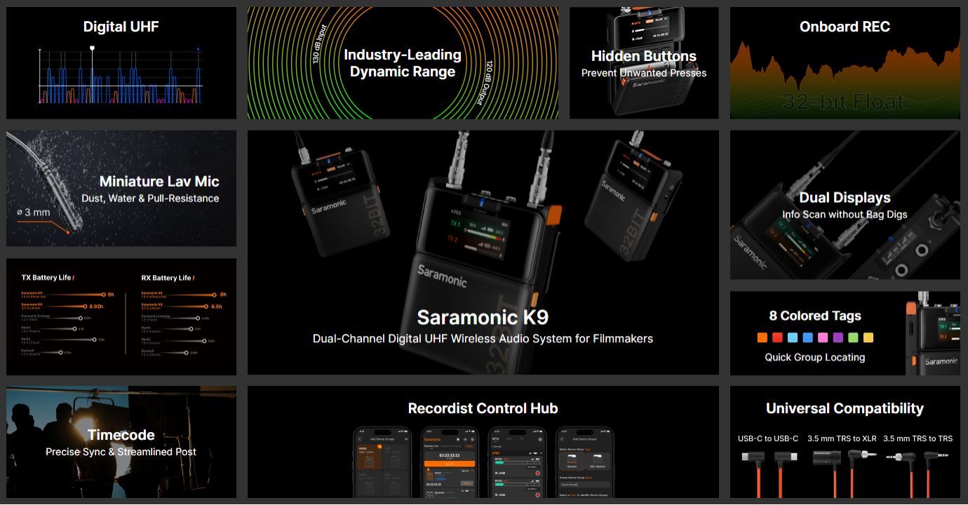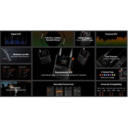The Saramonic K9 is a professional-grade, dual-channel UHF wireless microphone system built for high-end video production, broadcast, and demanding content creation. With advanced features like 32-bit float internal recording, GPS-based frequency management, timecode sync, and wide device compatibility, the K9 ensures exceptional audio quality in any environment.